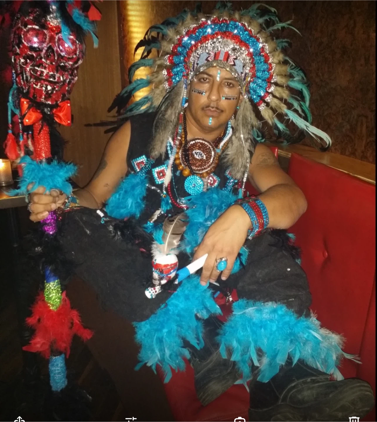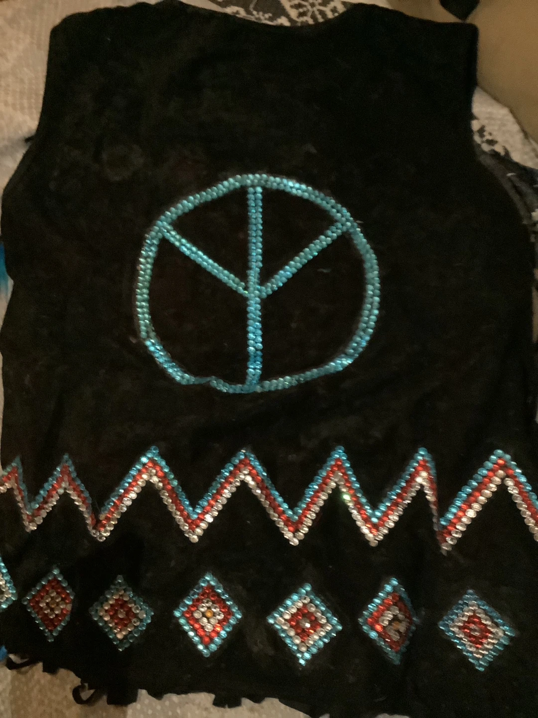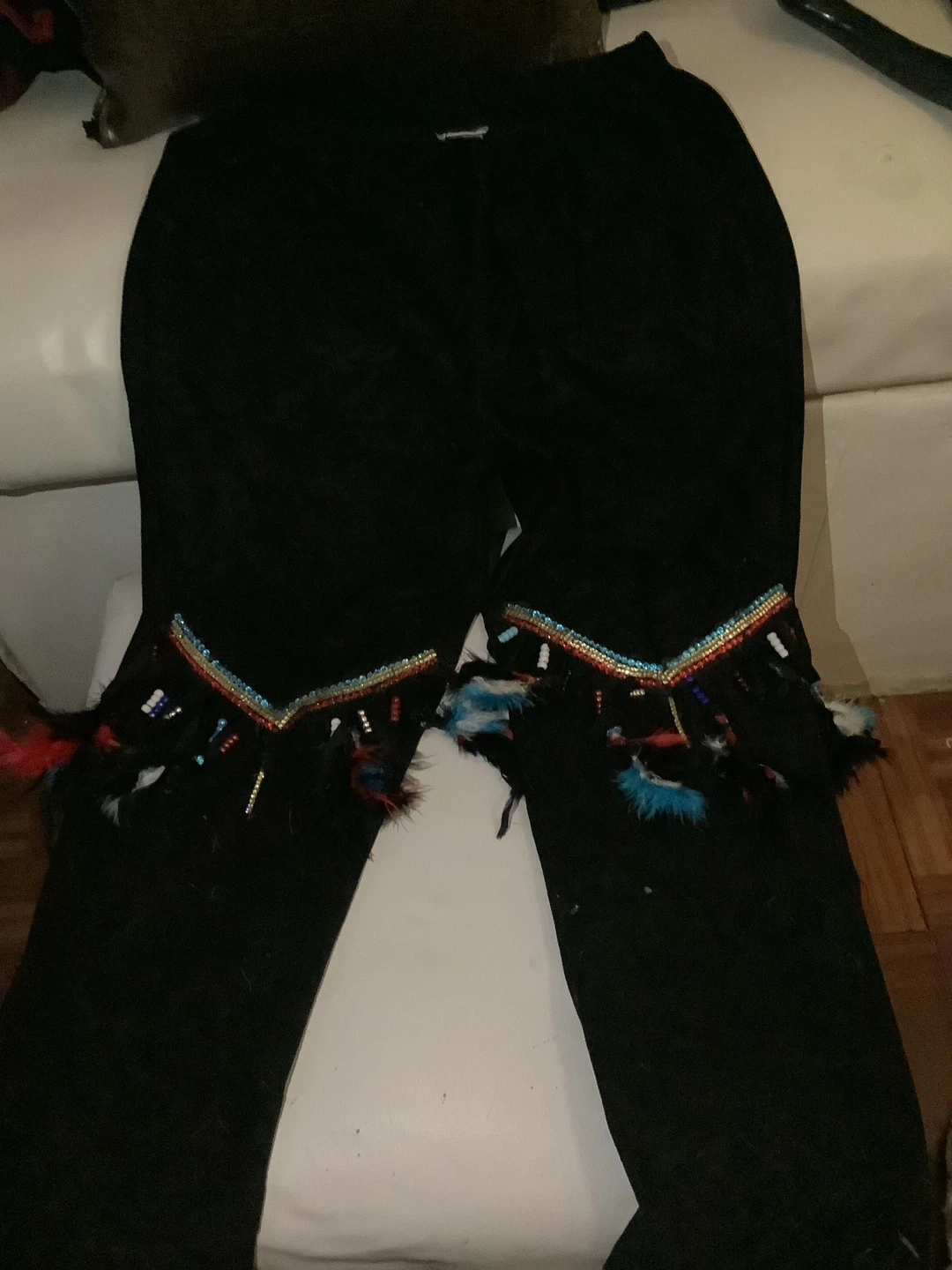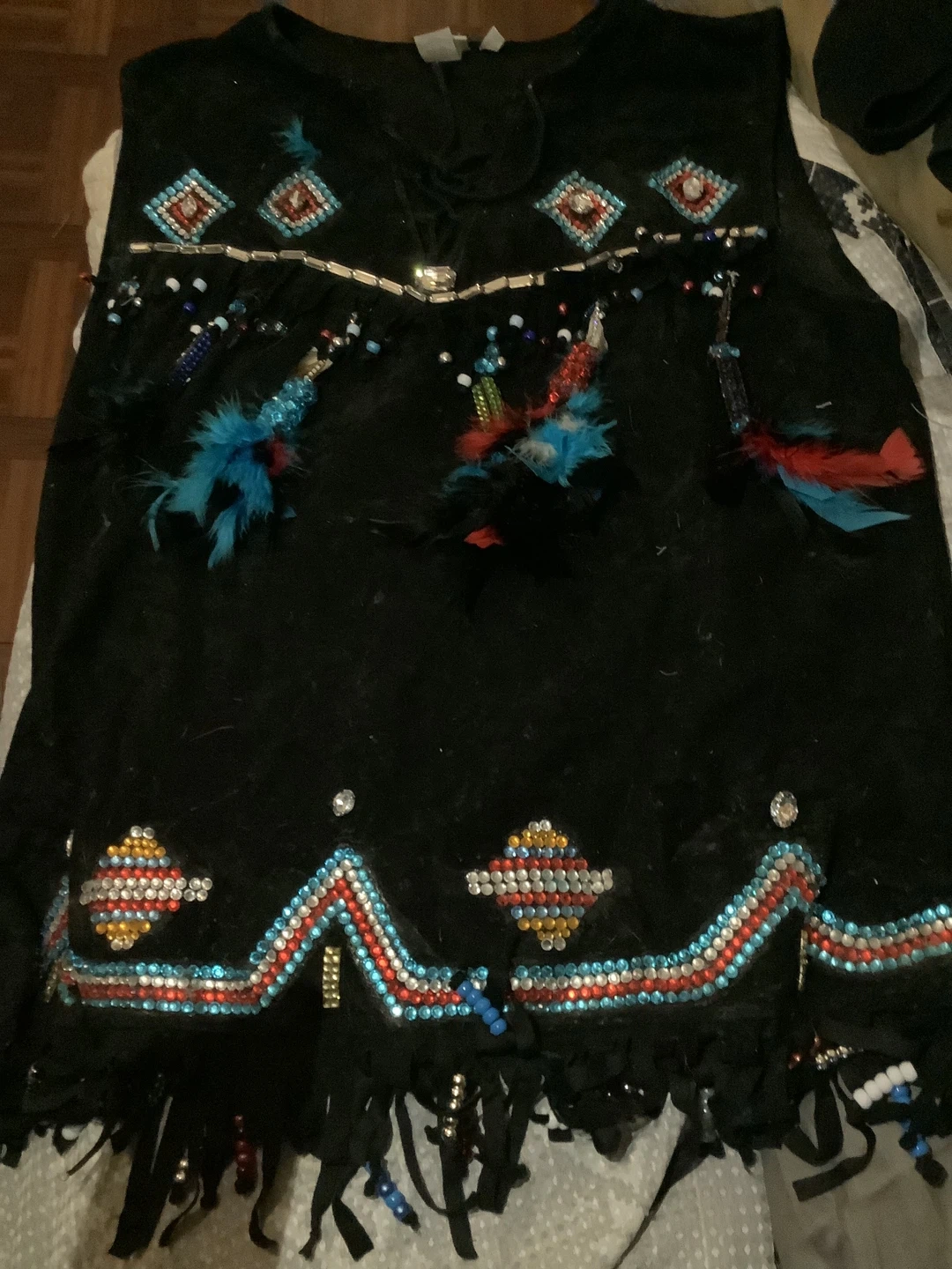 10Vibrant look with color studs added to Native American one size fits all original real hand made Head dress comes with Custom made sleeveless size large shirt And adjustable large pants all 3 items $60 great deal .. head piece alone cost $80 so just $60 for 3 is a must have let’s meet 800 Manila St Bx . Post office