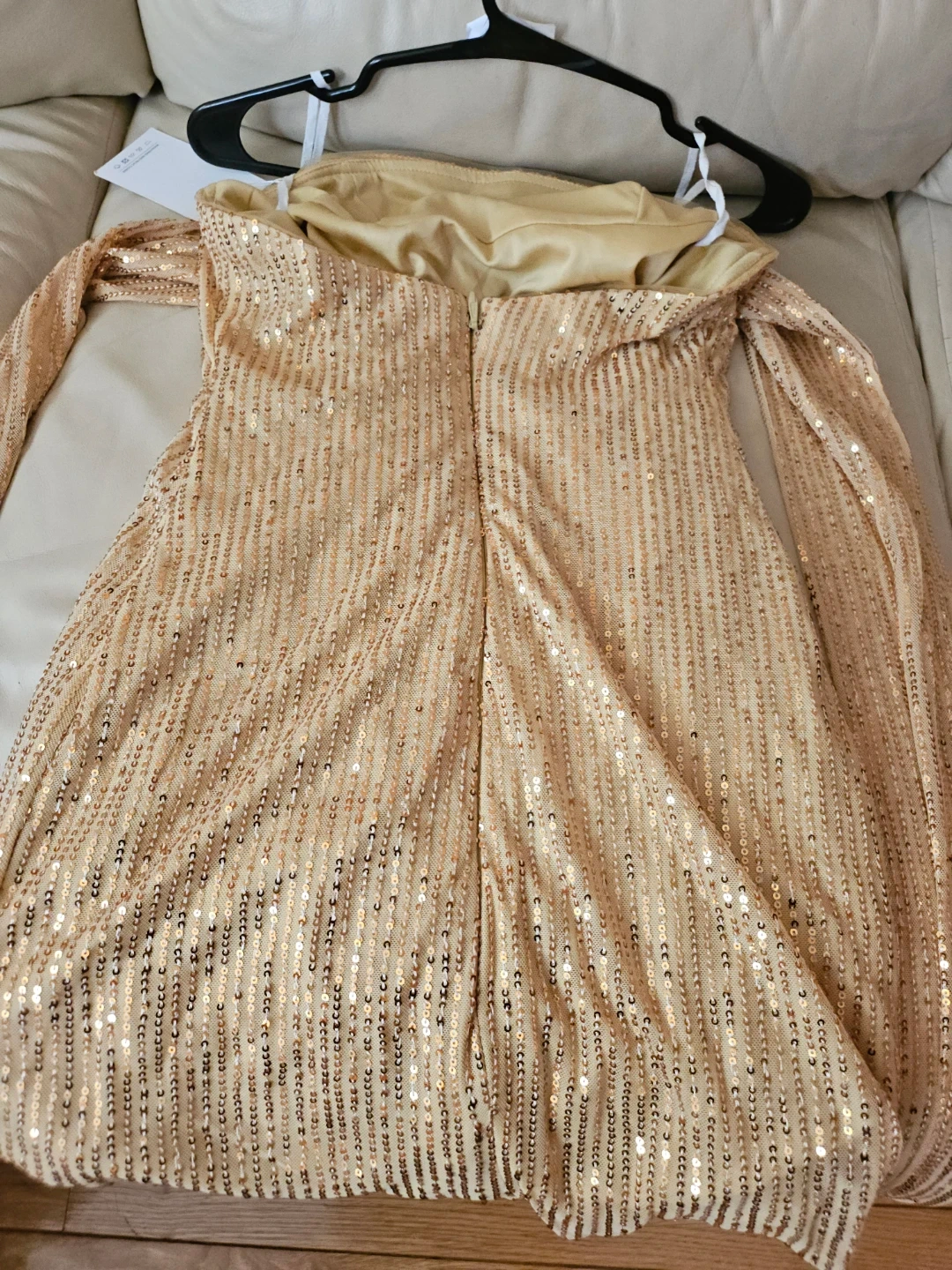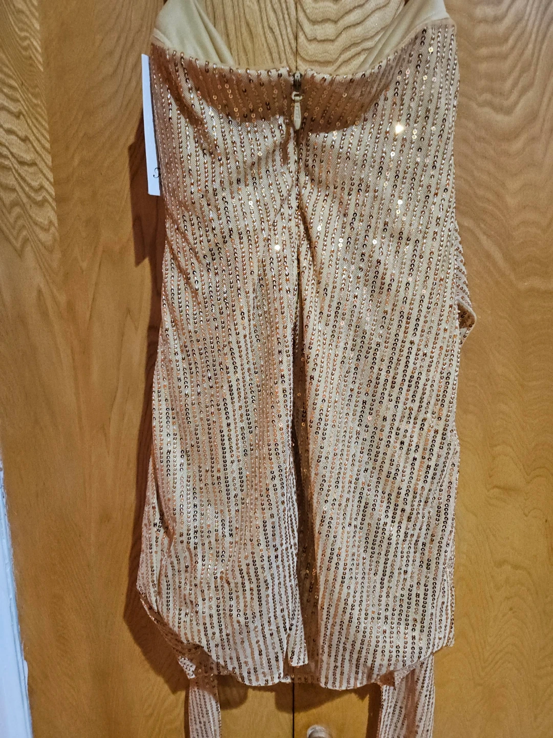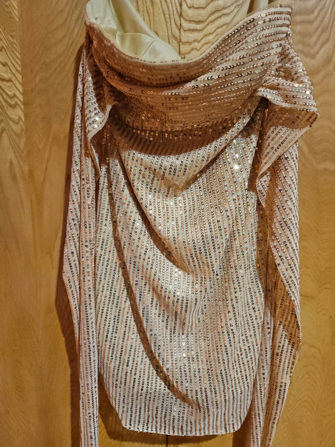 Sparkly strapless top with all-over sequins and a draped scarf detail. Features a back zipper closure. It's made with a polyester blend.