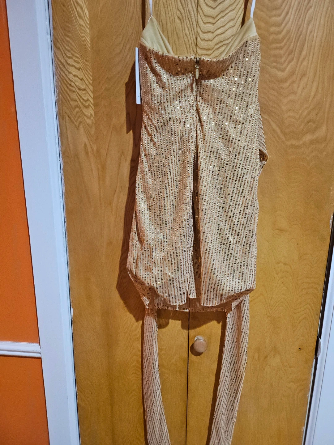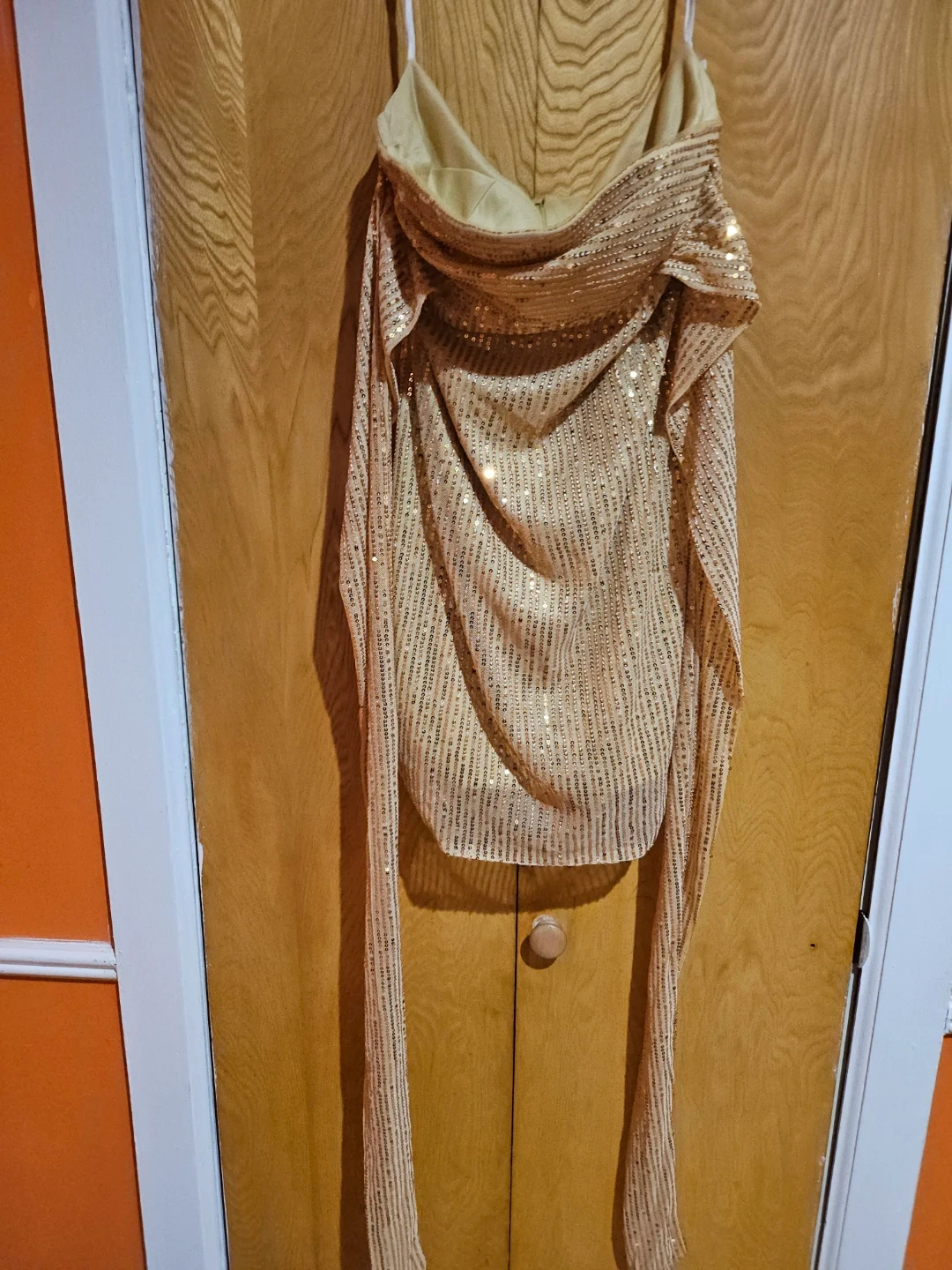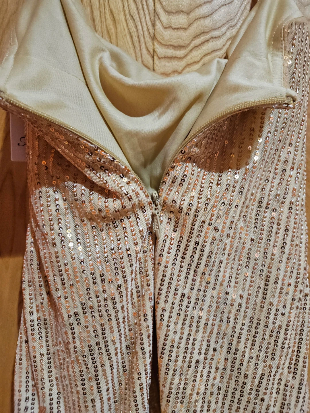Sparkly strapless top with all-over sequins and a draped scarf detail. Features a back zipper closure. It's made with a polyester blend.