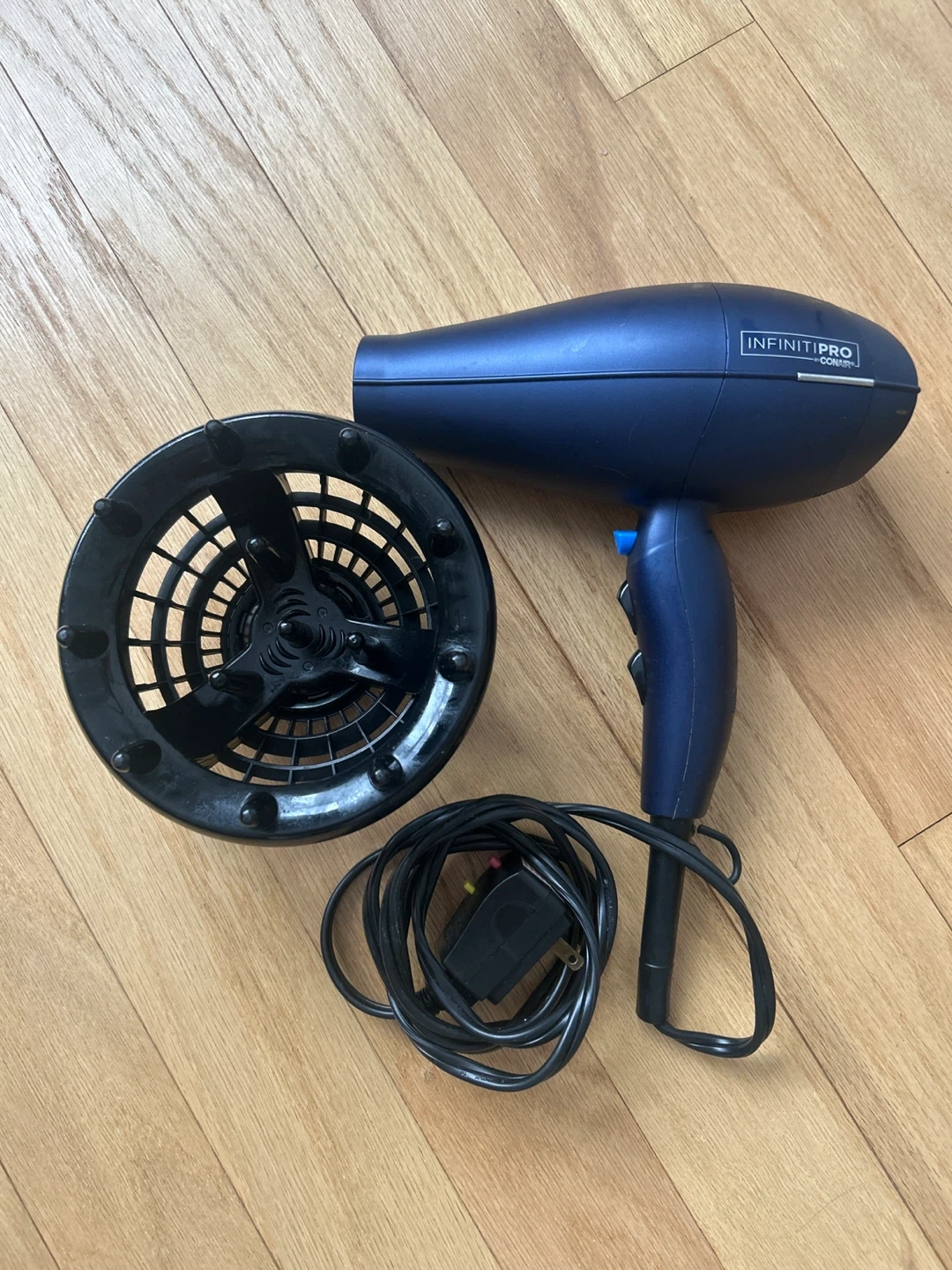 This is a Conair InfinitiPRO hair dryer in navy blue. It comes with a diffuser attachment and the power cord. Great for styling curly or wavy hair!