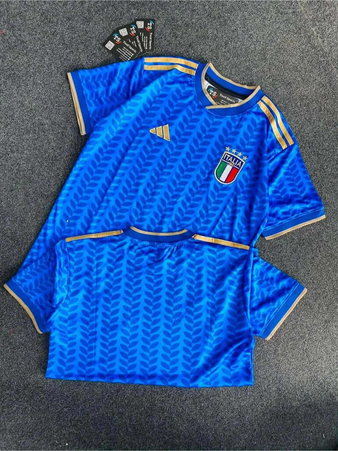 Blue jersey featuring the Italy national football team crest and gold accents on the collar and sleeves. All-over leaf pattern design. Made of polyester. Replica style.