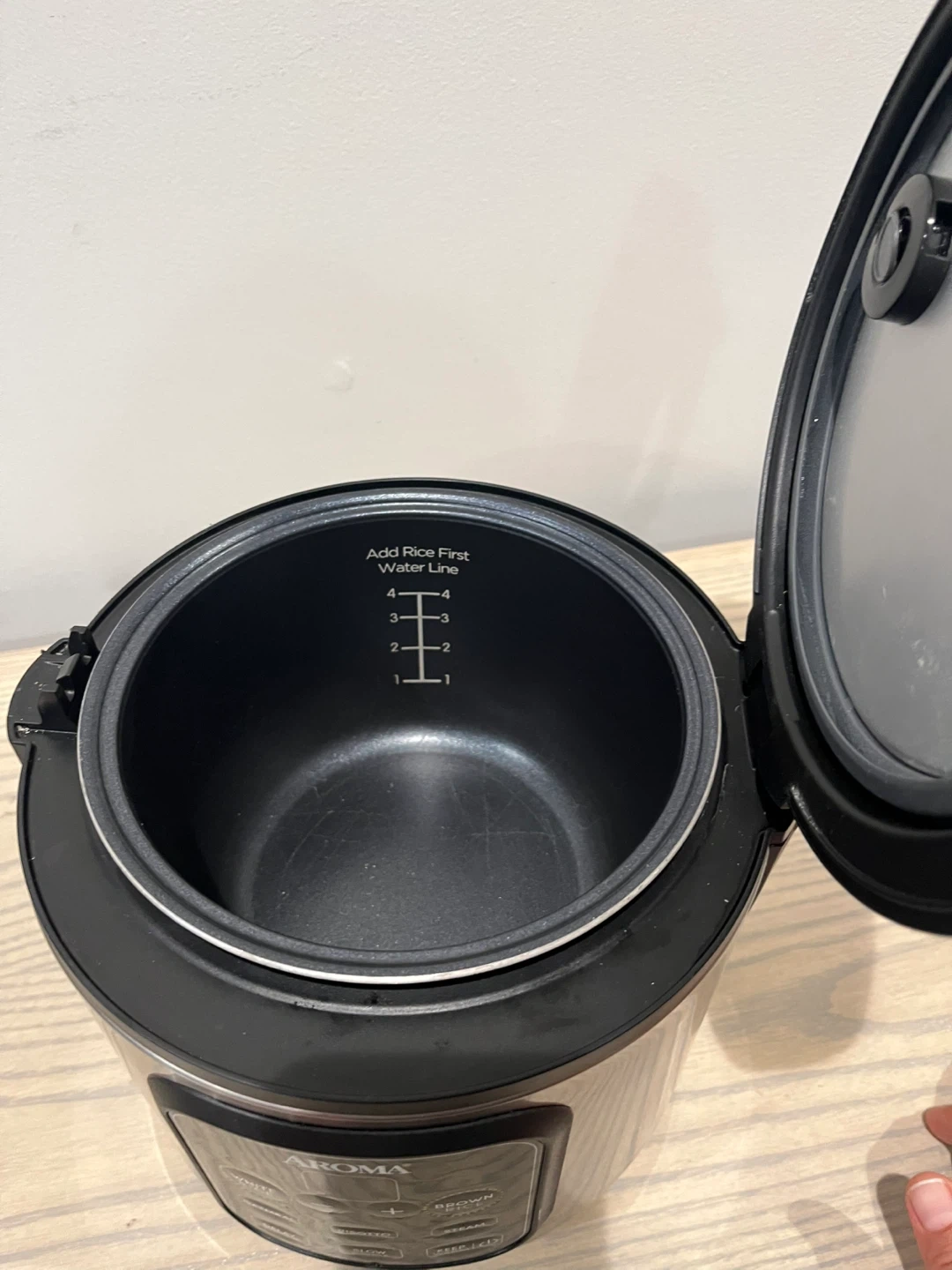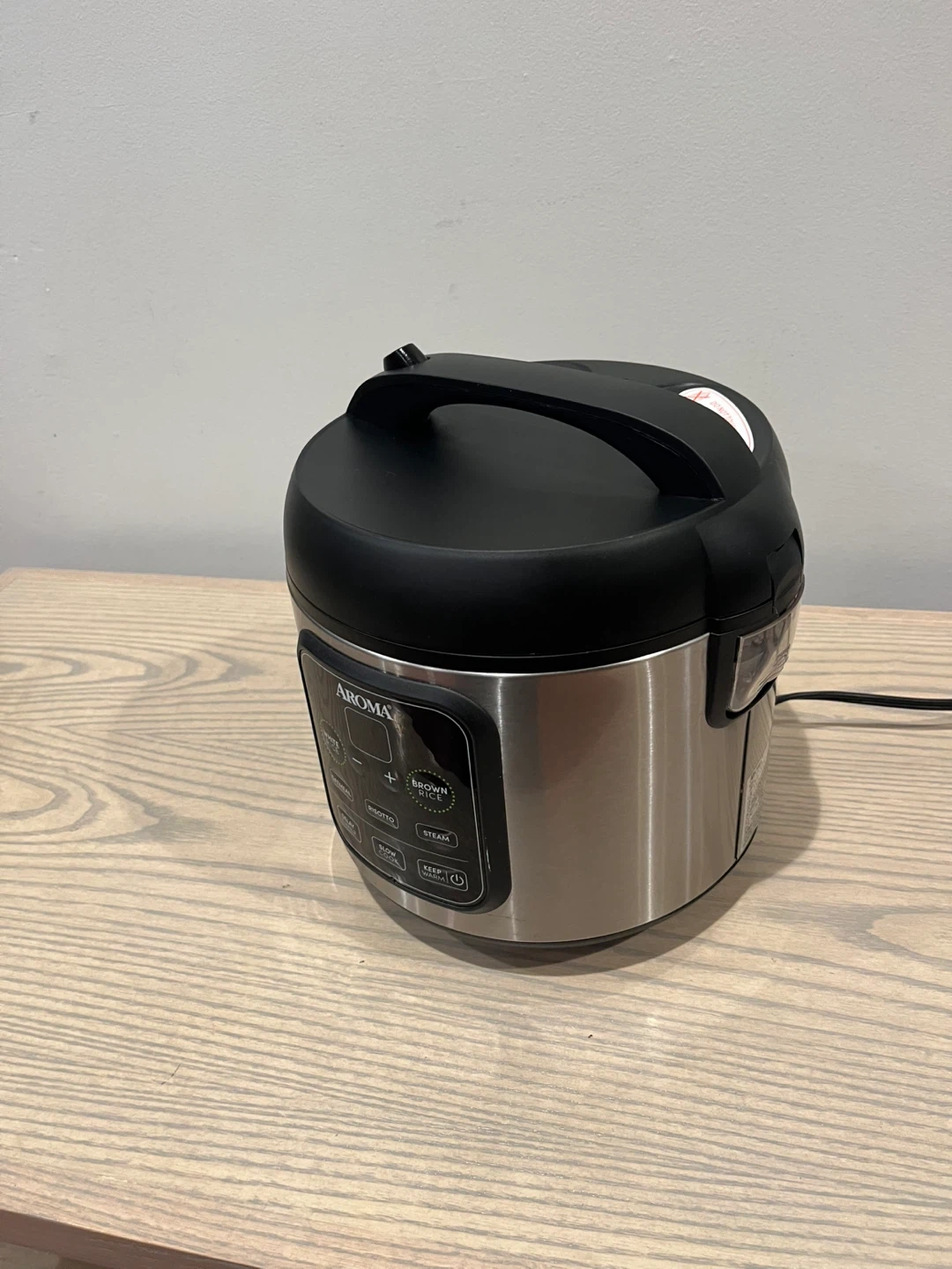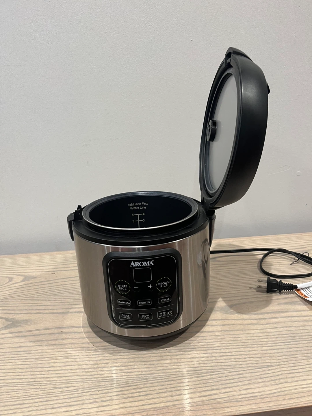This Aroma rice cooker is perfect for making rice! It has settings for white rice, brown rice, oatmeal, risotto, and steam. The inner pot is non-stick and includes measurement markings for water levels. A great addition to any kitchen! 4 cups