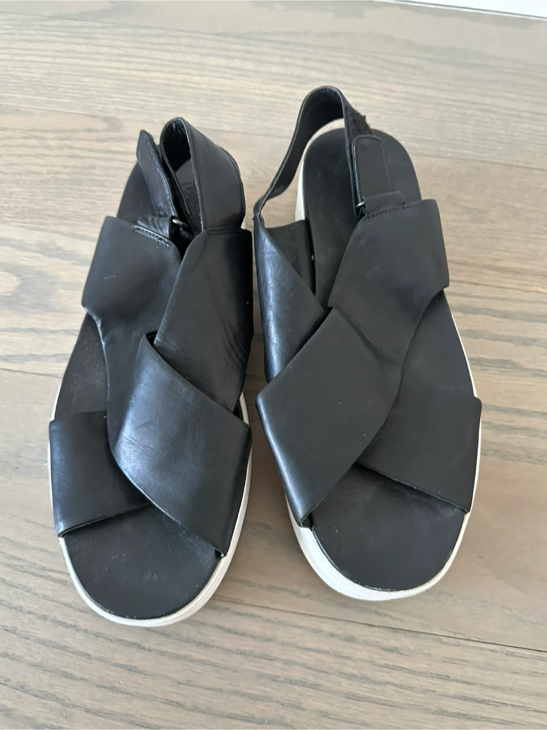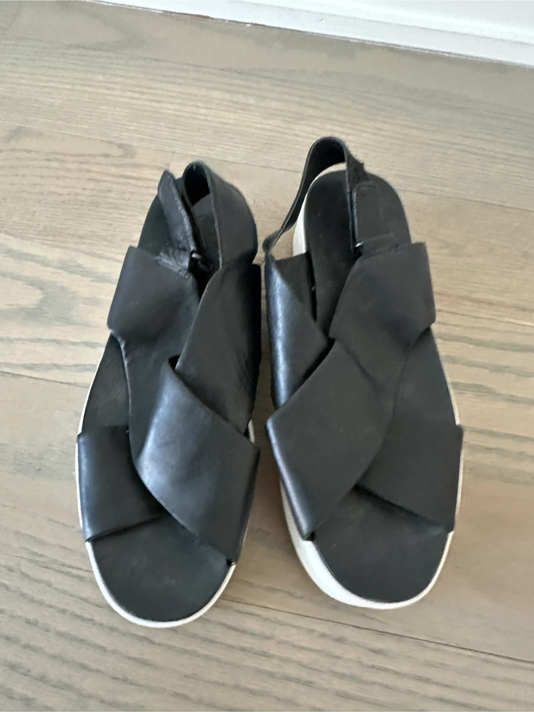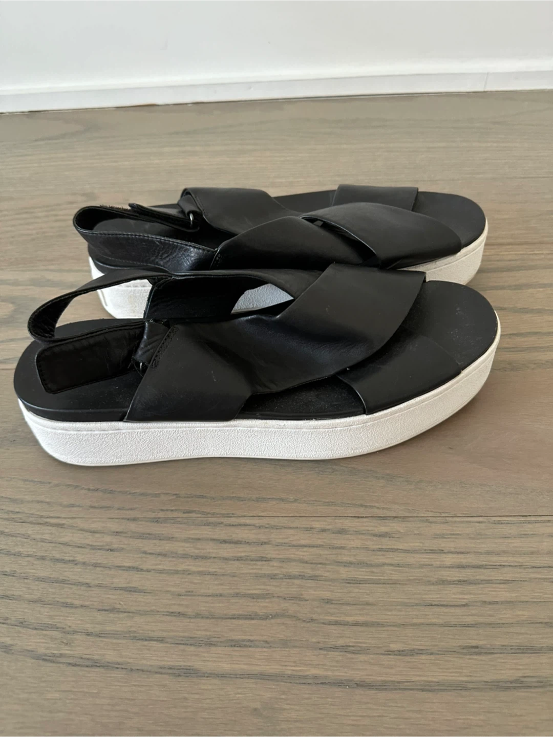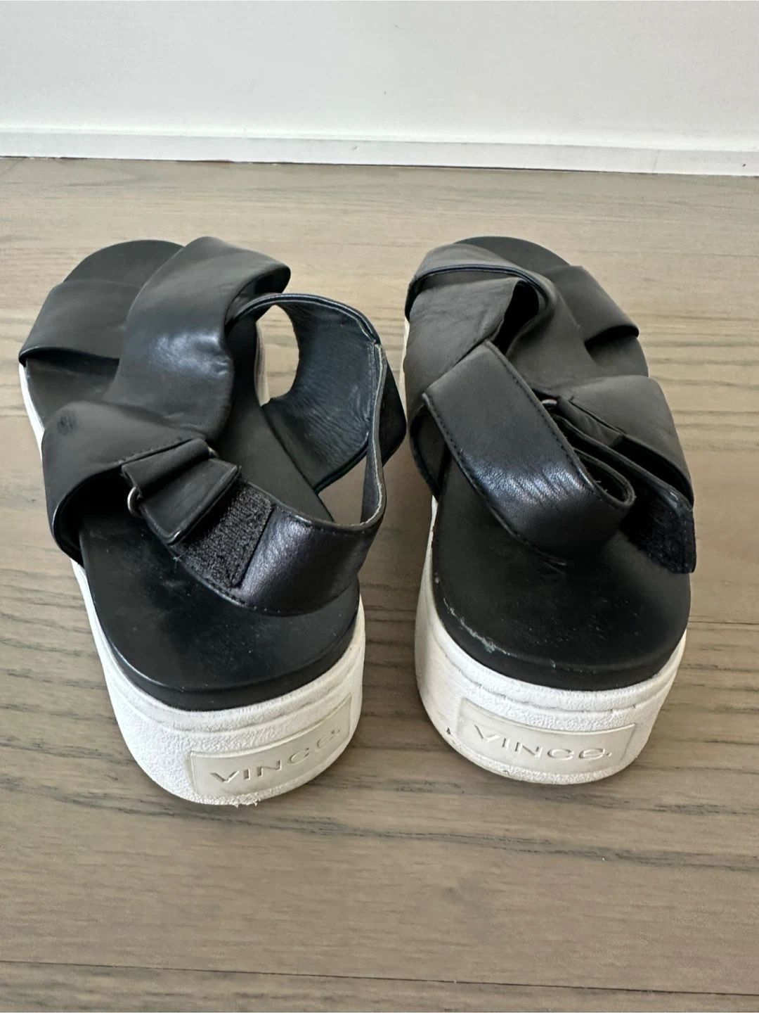 These are a pair of Vince women's platform sandals in black leather. They have a unique strap design and a comfortable platform sole. Perfect for adding a touch of style to your casual outfits!