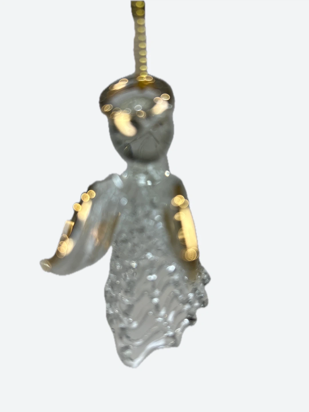 This delicate glass angel ornament features a clear, textured body with subtle gold accents on the wings and halo. It hangs from a golden string, ready to adorn a tree or window. Adds a touch of sparkle and charm to any holiday display! Collectible. New