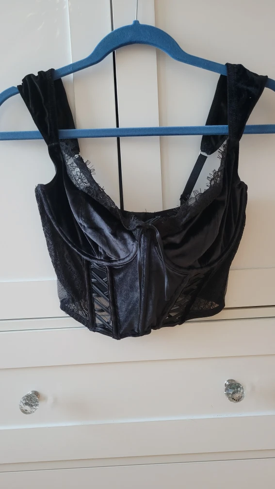 Selling a beautiful black corset top from Victoria's Secret! It features delicate lace detailing and a flattering silhouette. Perfect for dressing up or adding a touch of elegance to any outfit