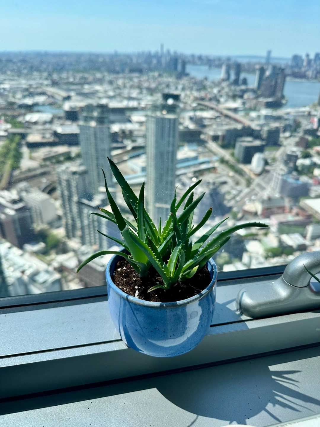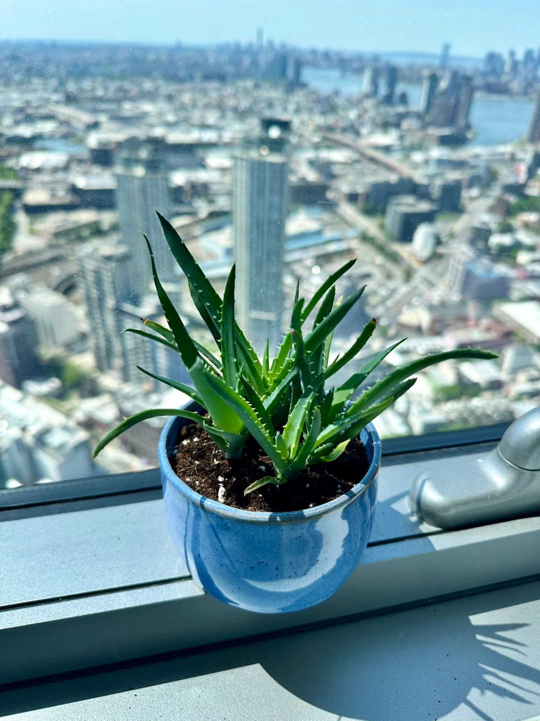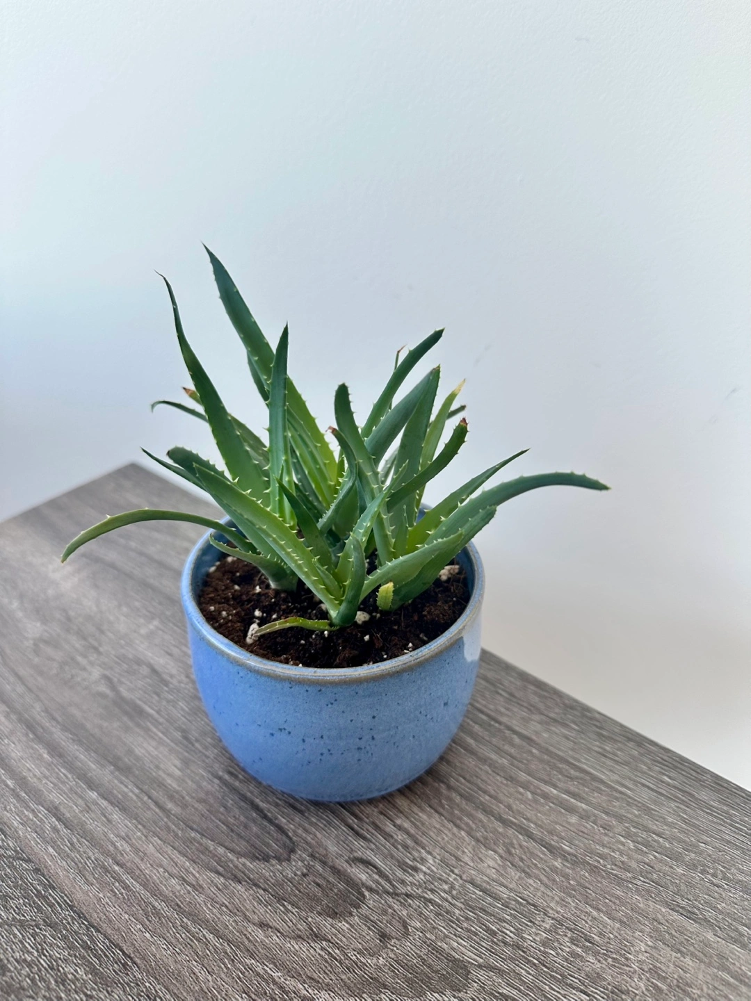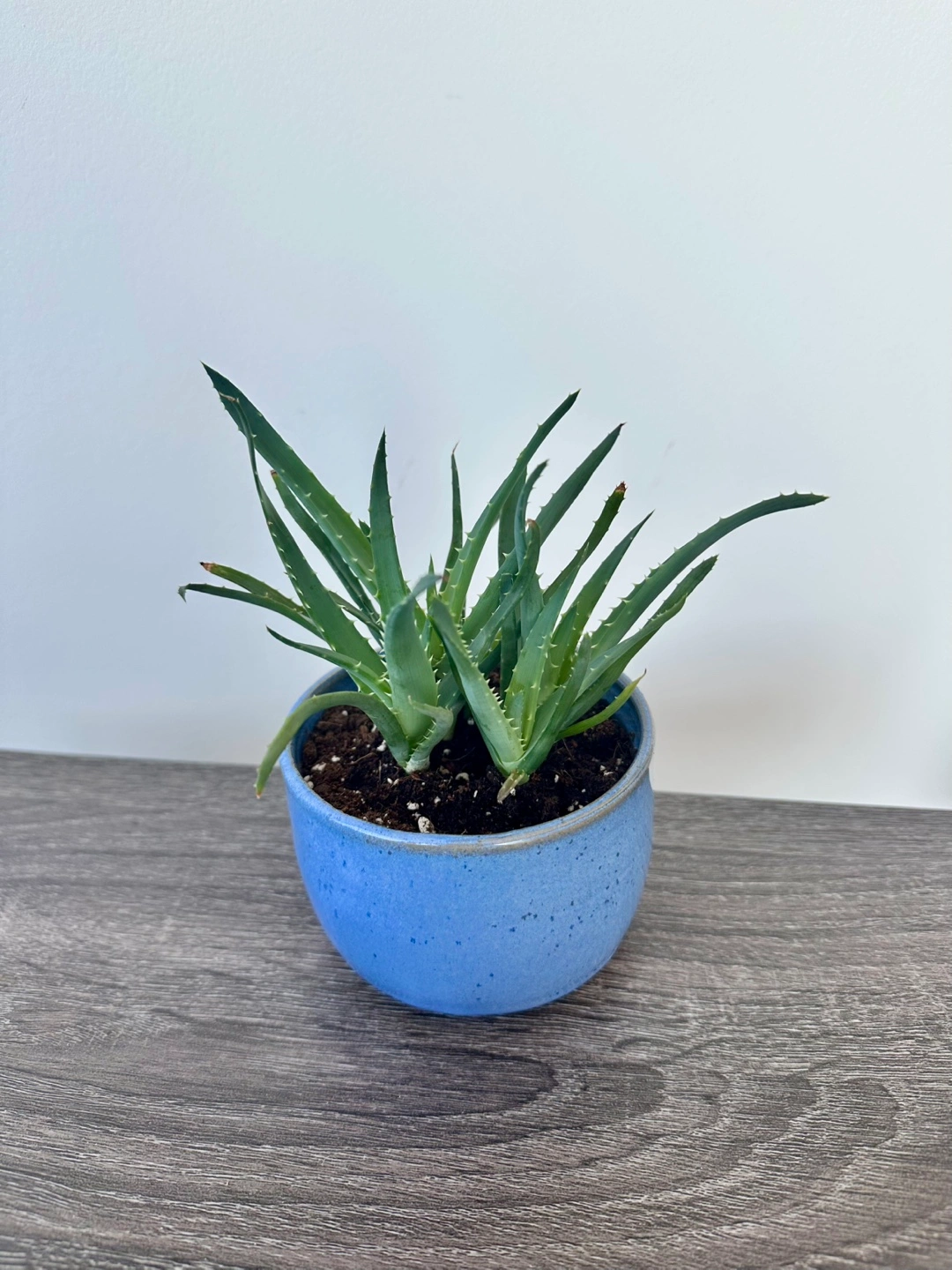 Healthy aloe vera plant. Small size, perfect for a desk or windowsill. Planted in a speckled light blue ceramic pot. Great addition to any home.