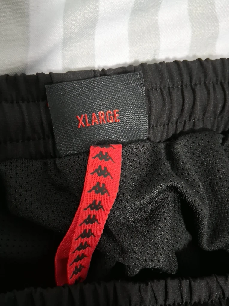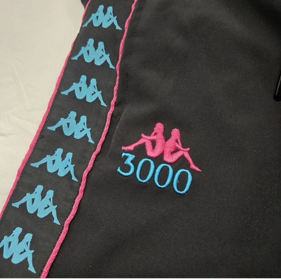 Selling a pair of Kappa x Gumball 3000 track pants in size XL! These black pants feature a unique design with pink and blue accents. They're in great condition and ready for a new home