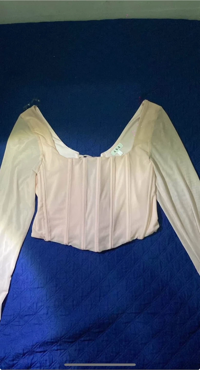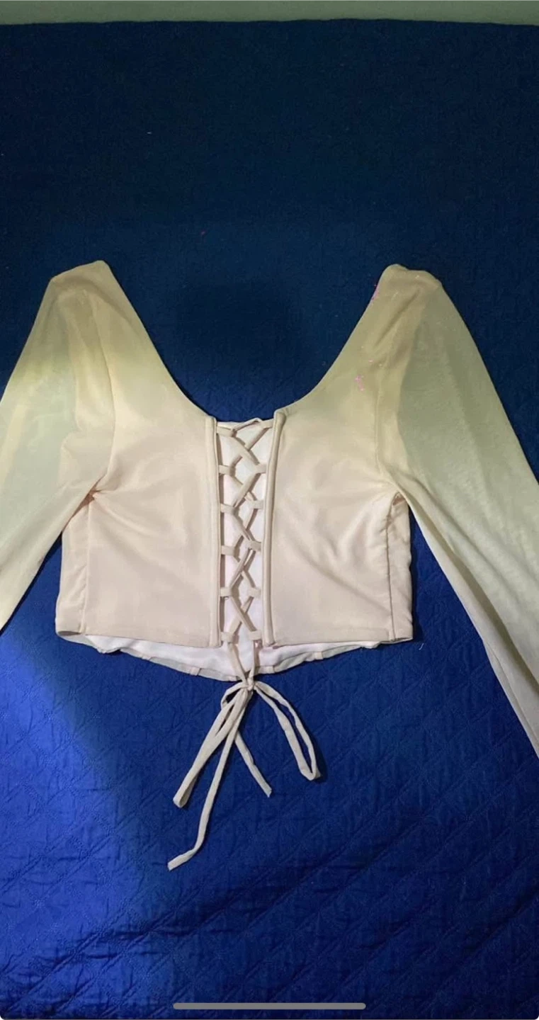 Here's an AYA long sleeve corset top! It's a beautiful cream color and features a lace-up back. Perfect for a night out or a special occasion