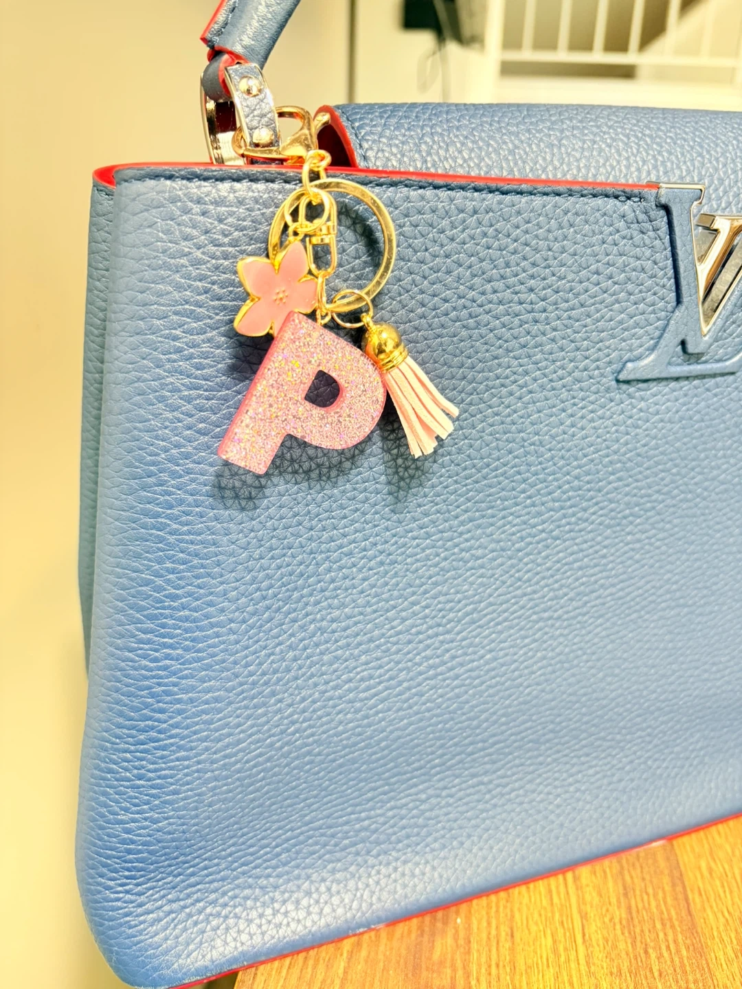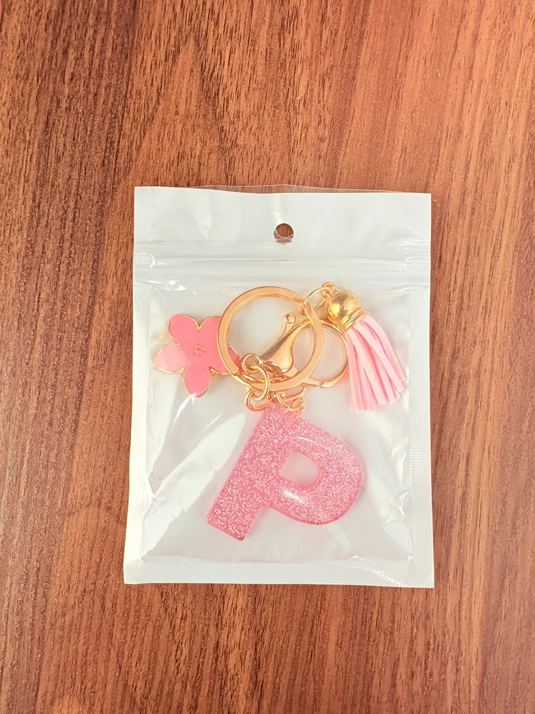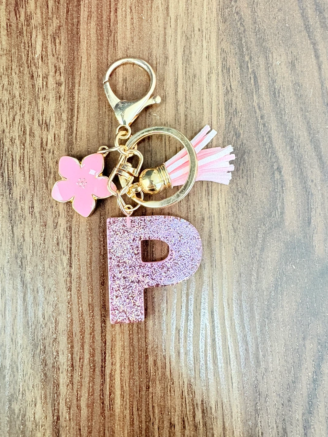 Pink Glitter "P" Letter Keychain with Flower Charm