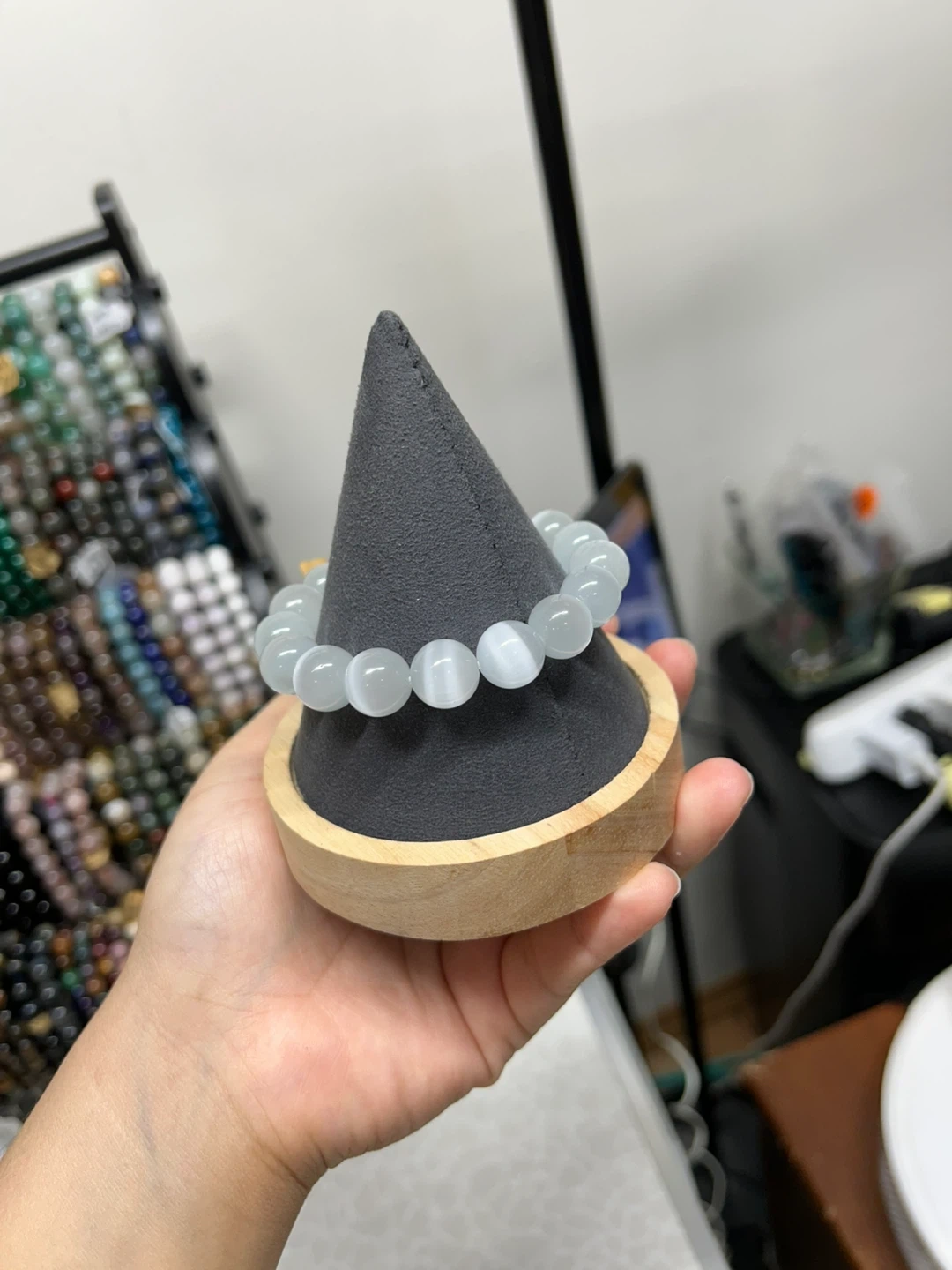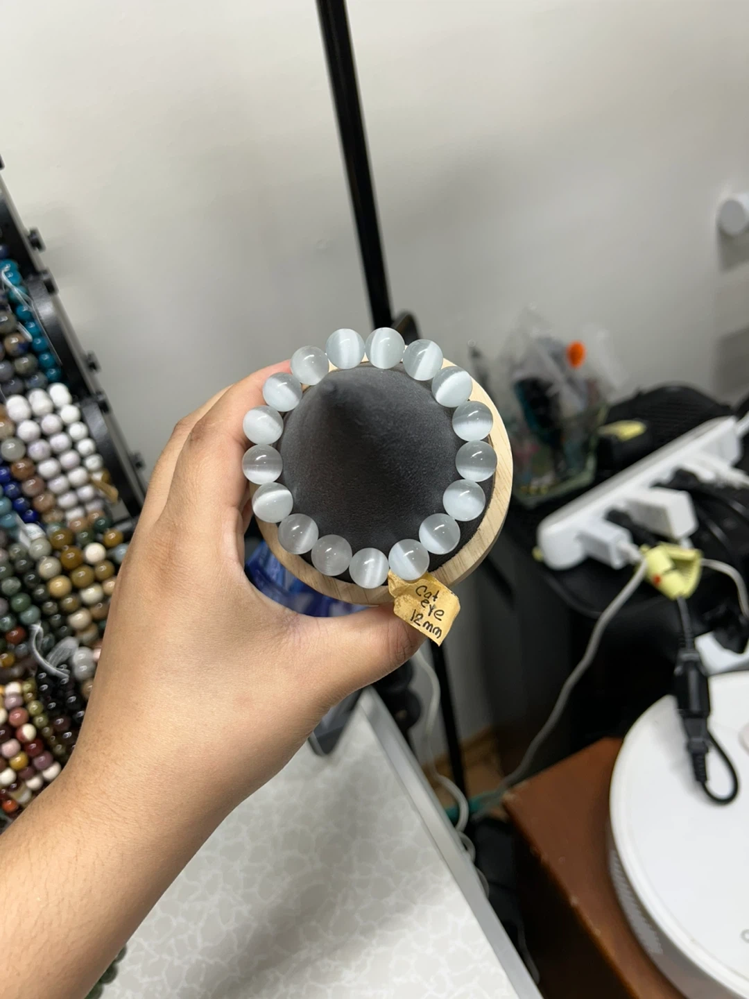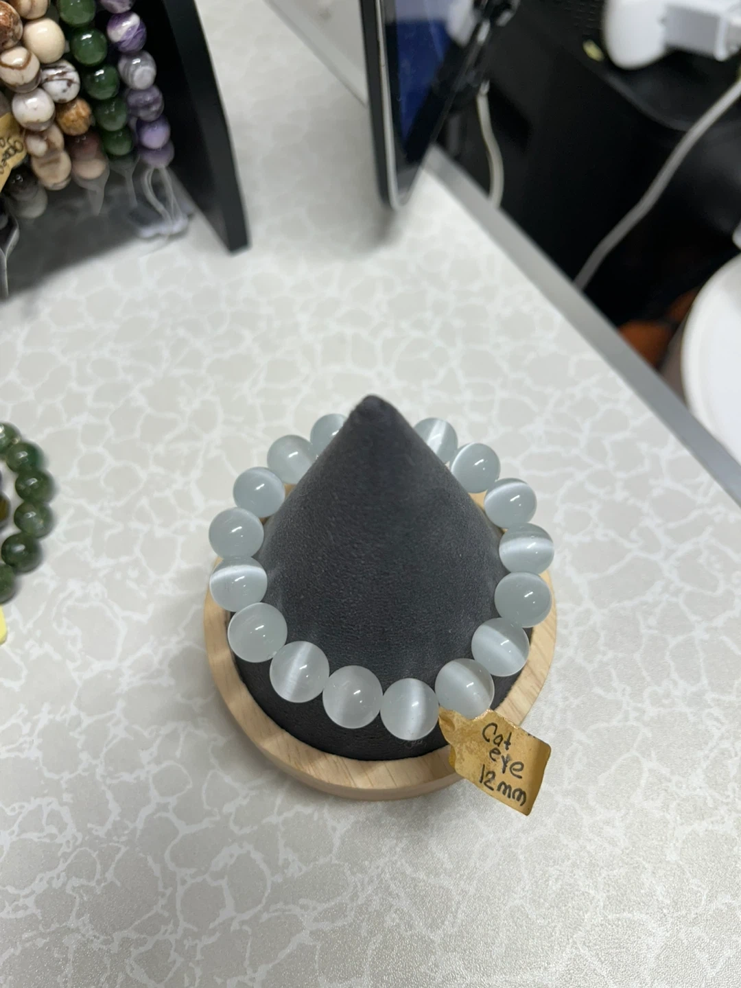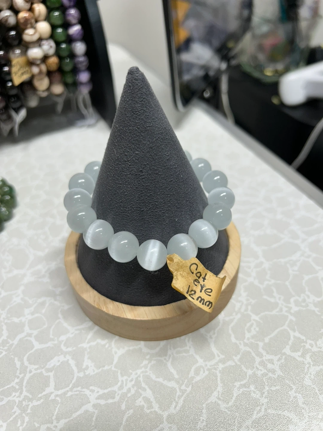 This is a bracelet handmade with 12mm cat eye beads. The beads have a distinctive sheen. It's strung on an elastic cord for easy wear. Wrist size 6 1/2