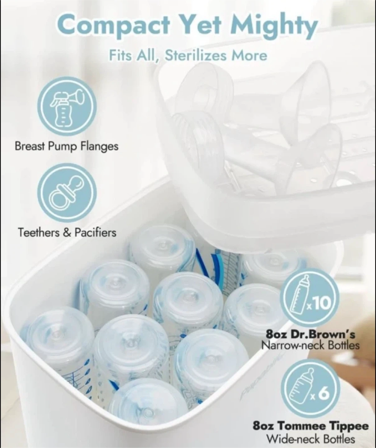Keep your baby's bottles clean and sanitized with this Papablic Baby Bottle Electric Steam Sterilizer & Dryer! It's designed to fit all bottle sizes and sterilizes more items at once. It also features a super-hot air speed drying function for thorough drying, and it's more efficient in drying than other brands. It uses intense steam to clean, offering 99.99% natural steam sterilization