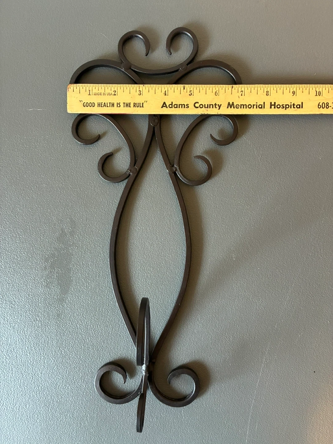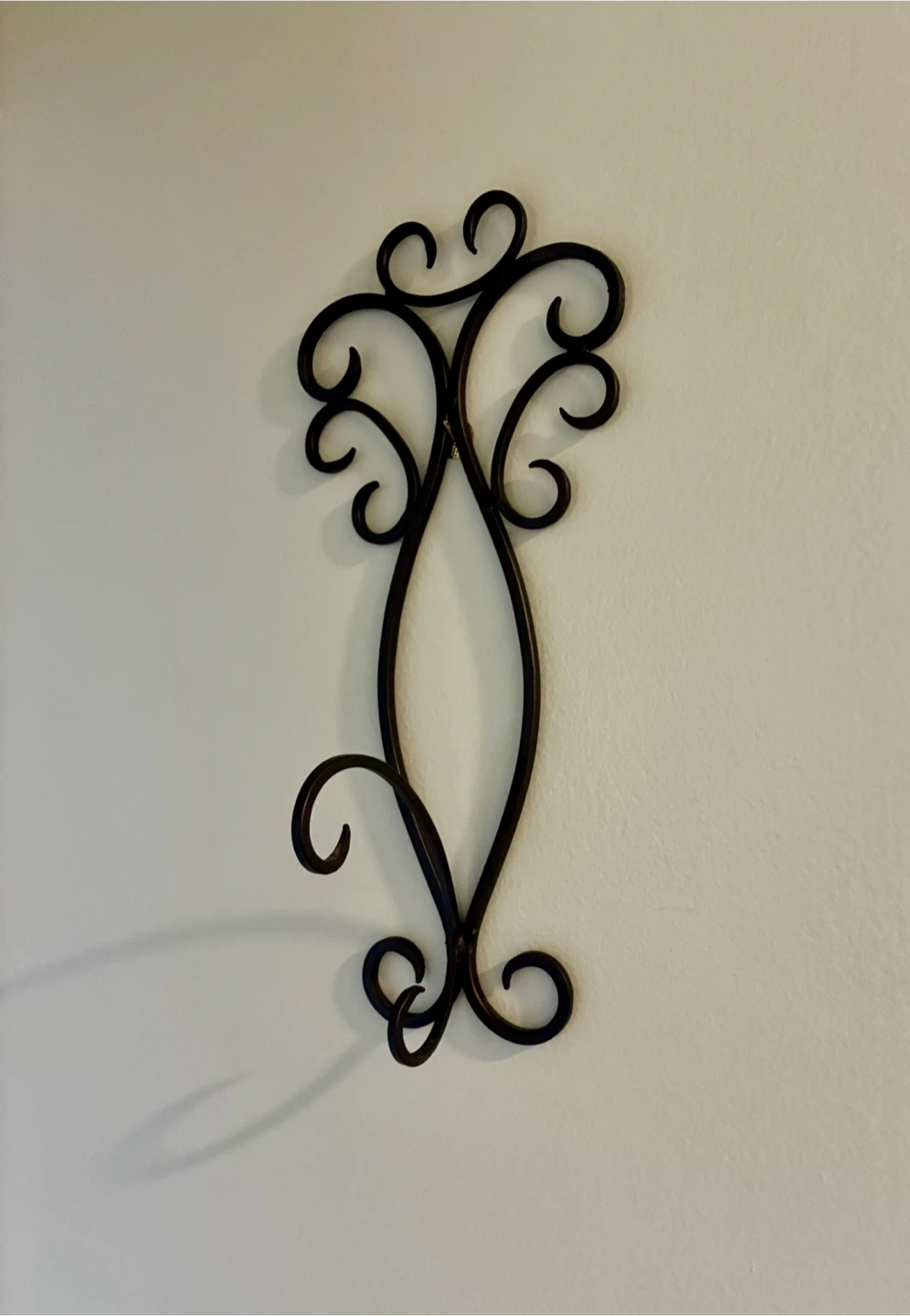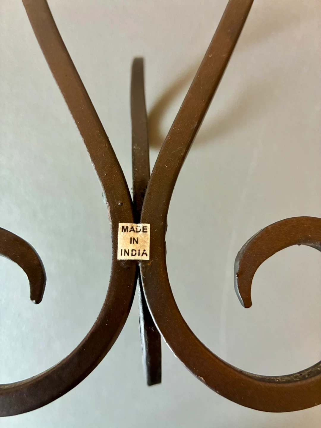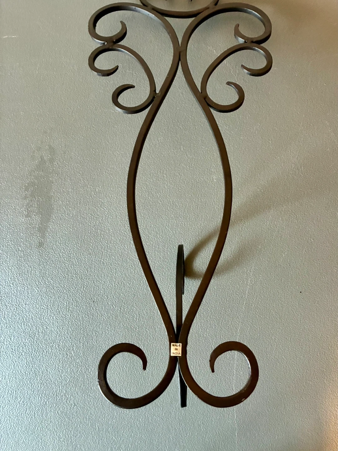 Decorative metal wall sconce holder with scrollwork design. It's made of metal and was manufactured in India. This piece adds an elegant touch to any wall, perfect for holding a small plant or decorative item!