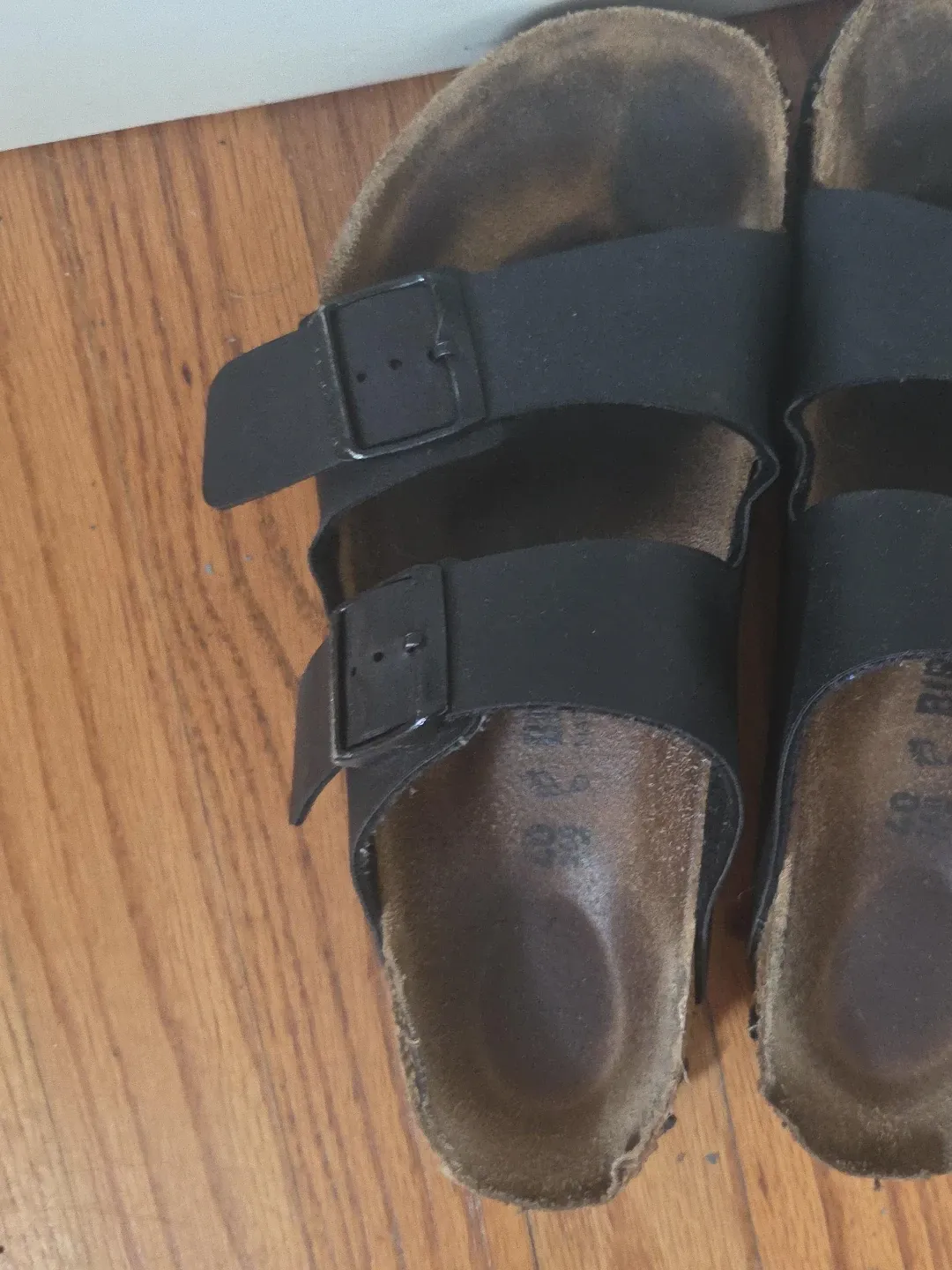 Classic black Birkenstock Arizona sandals. These are a size 38. They feature two adjustable straps for a secure fit. The cork footbed provides comfortable support.