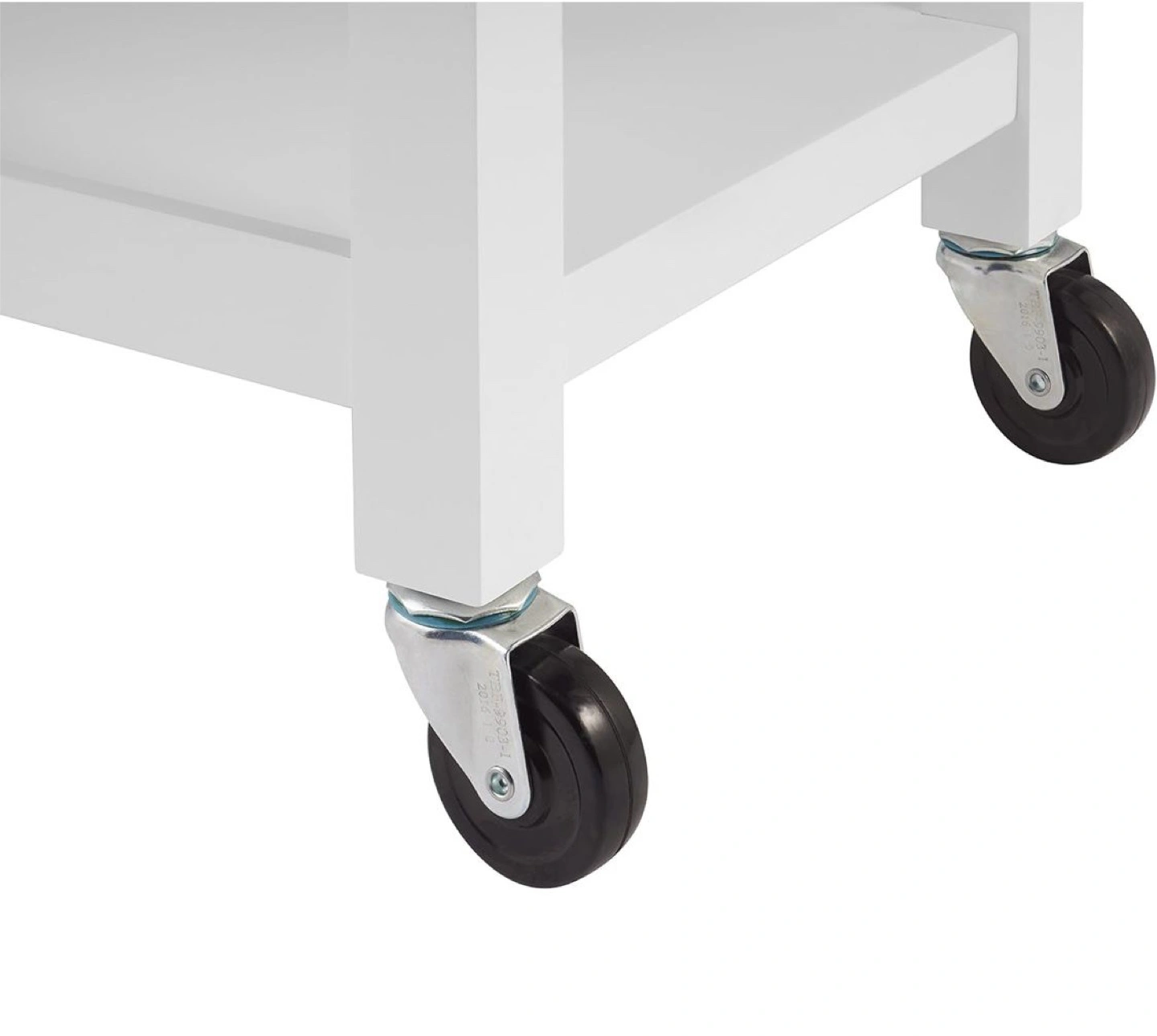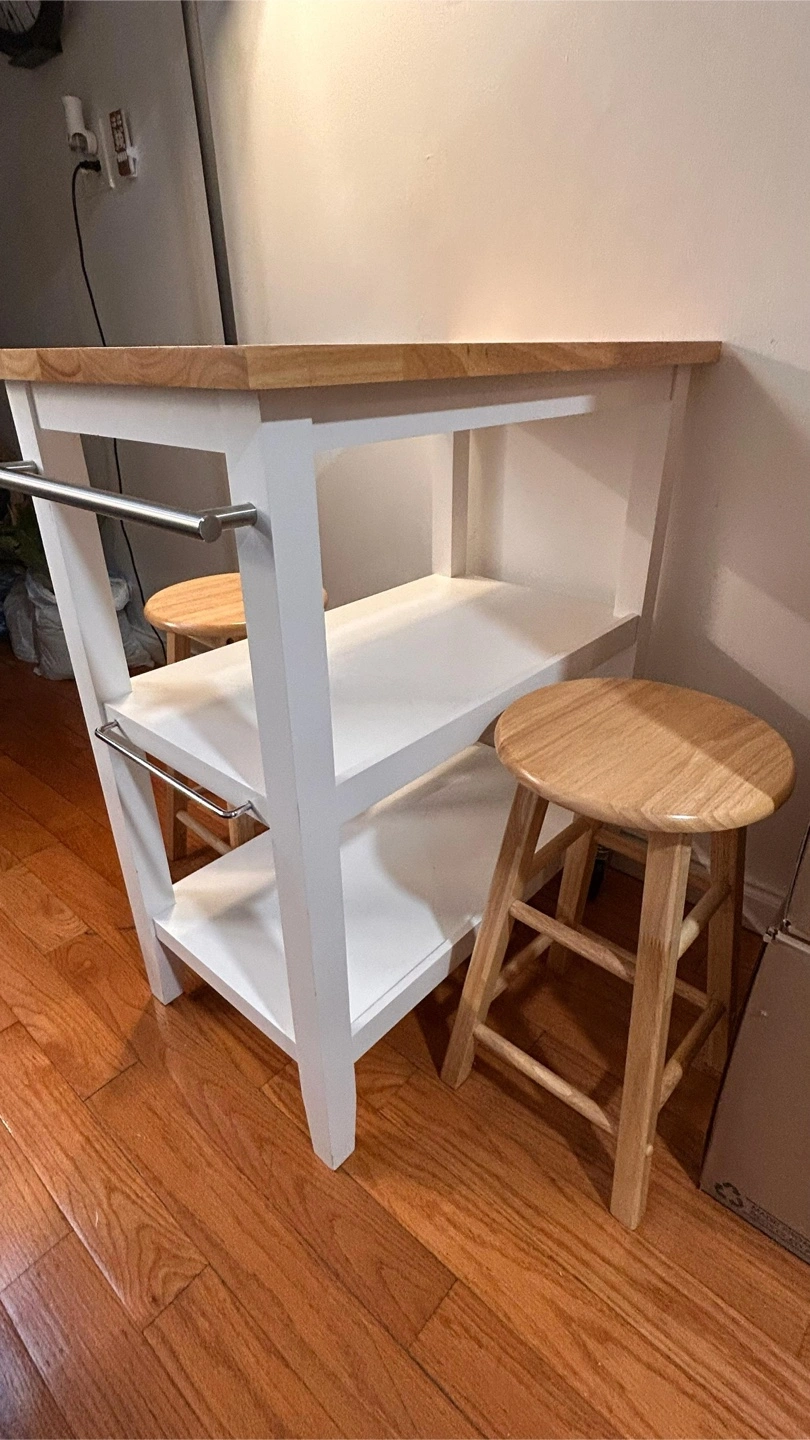 Selling a kitchen island with 2 matching stools. It features a butcher block top and white painted frame. There are shelves for storage and a towel rack on the side. Great for adding extra counter space and seating to your kitchen! Great for a studio apt too.