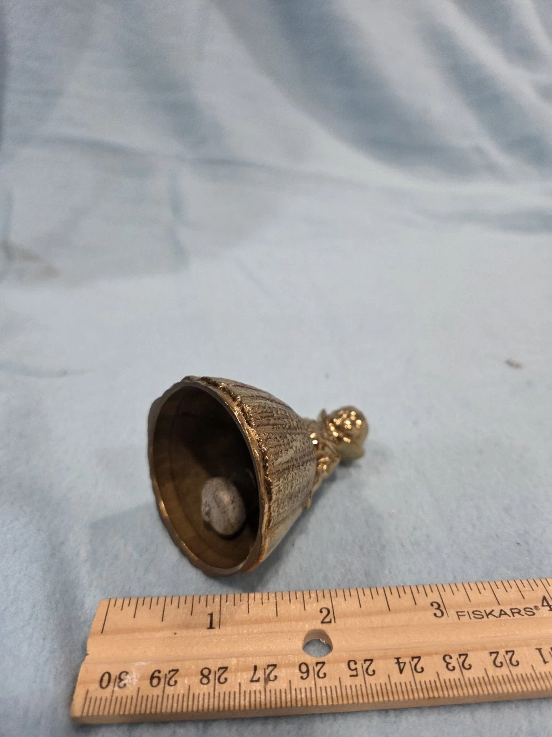 This is a used, unbranded brass bell with an antique brass finish, designed in a Victorian style. It's a small, gold-colored bell suitable for adults and can be placed in any room. It's an original piece from the United Kingdom, not a reproduction. Let me know if you're interested!