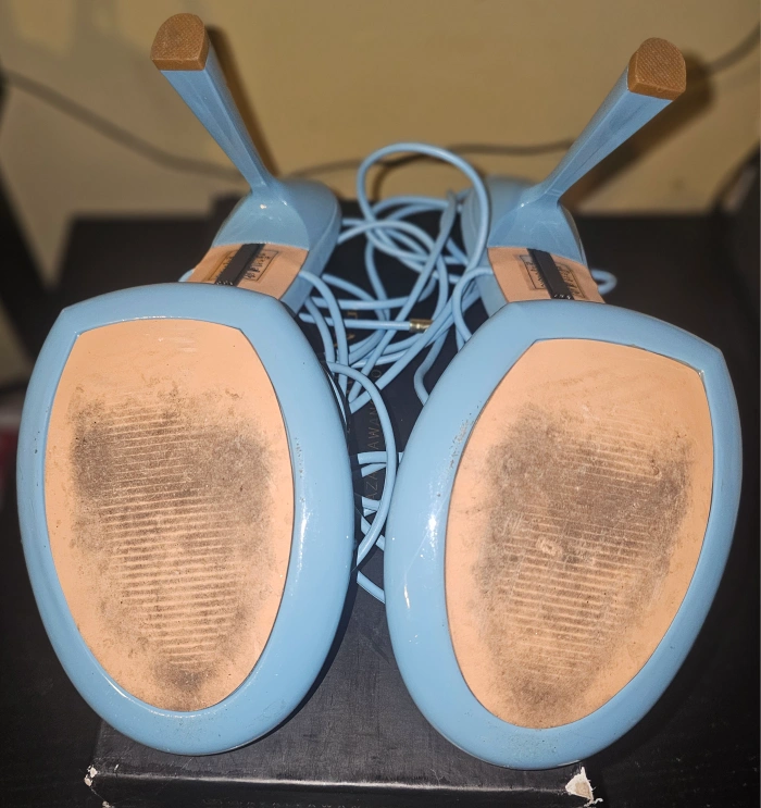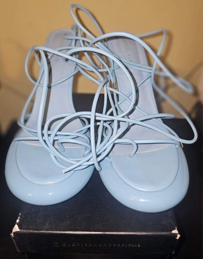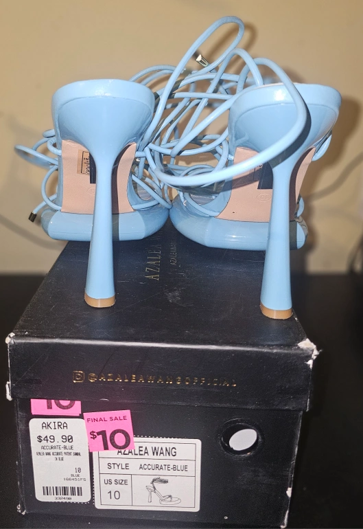 Selling a pair of Azalea Wang Akira heels in the Accurate-Blue color. They are a US size 10. The original price was $49.90. They show some signs of wear on the soles, but otherwise, they're in good condition and come with the original box