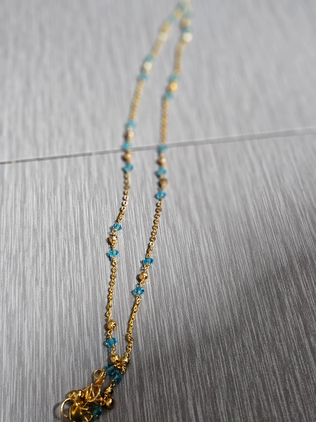 Gold chain anklet. Features small blue and white beads. Simple design. Perfect for summer.