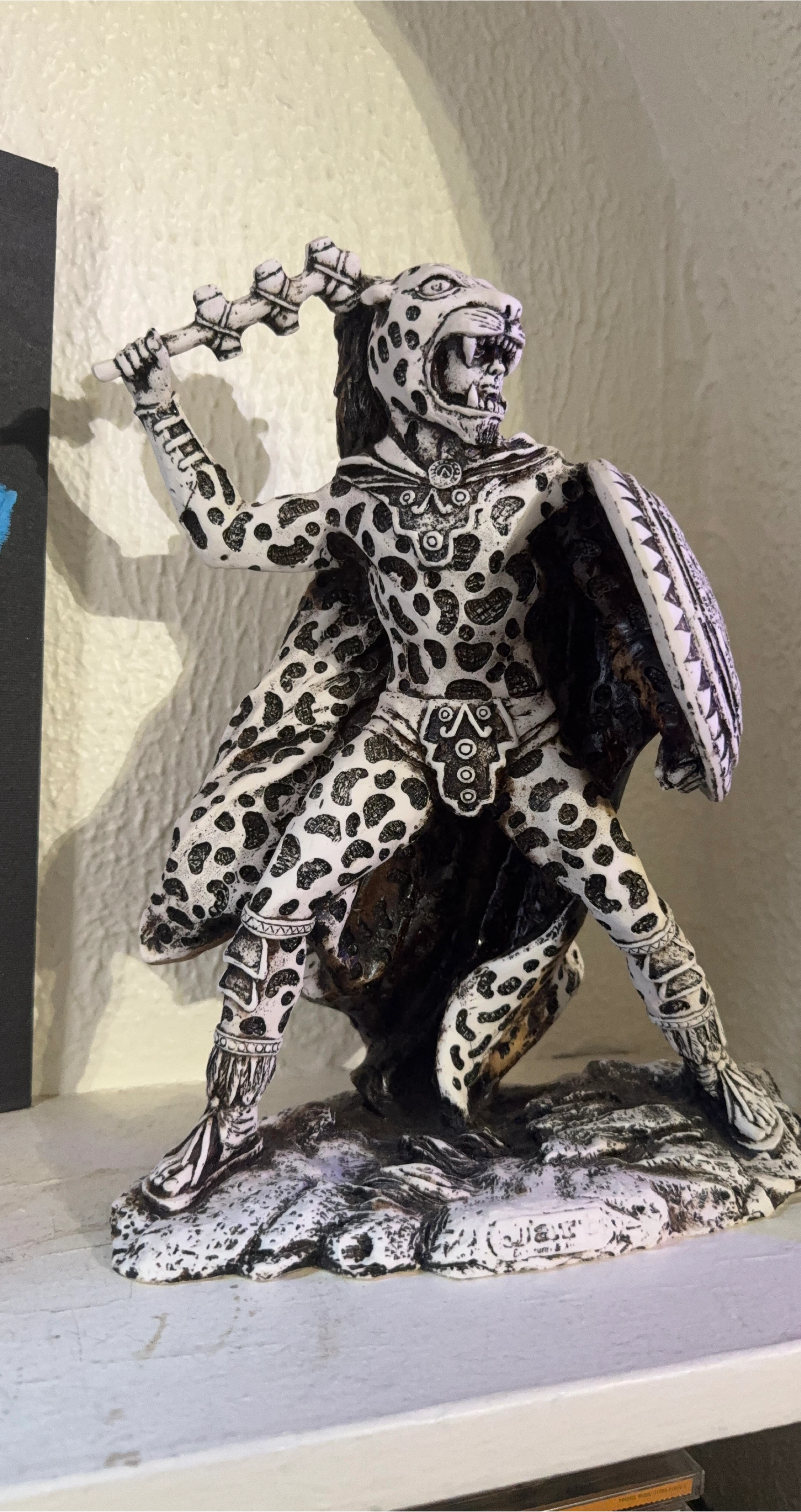 65This is a statue of an Aztec Jaguar Warrior. It features a detailed design with the warrior holding a weapon and shield. The statue is primarily white with black spots, giving it a unique and striking appearance. It would make a great addition to any collection or as a decorative piece