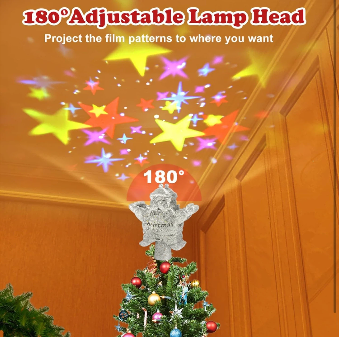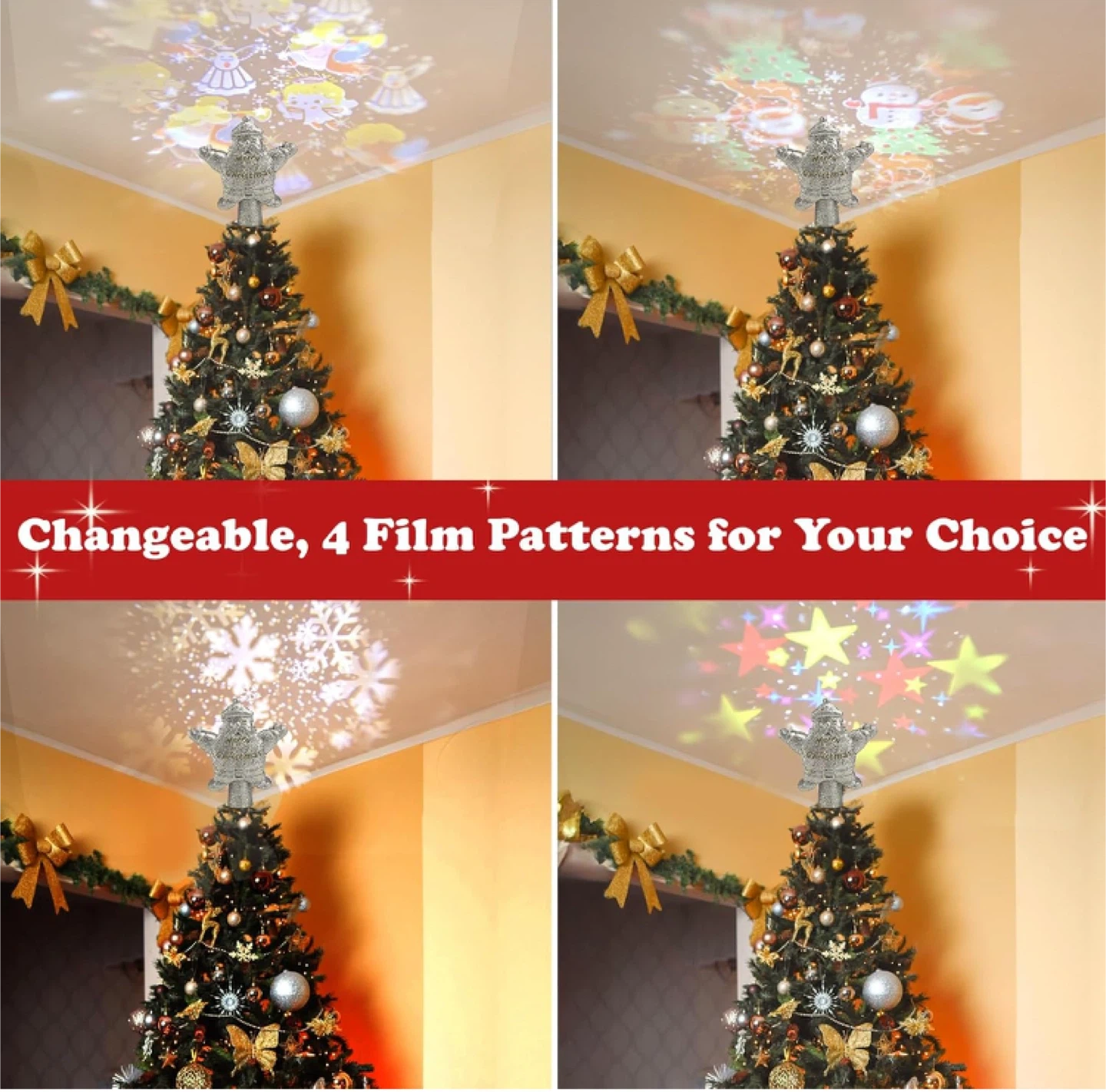 Christmas Tree Star Topper, Silver Santa Claus Tree Topper Projector, Snowflake Projector Tree Topper, Built-in 360° LED Rotating Lights with 4 Patterns Dynamic Projection for Xmas Tree Decoration