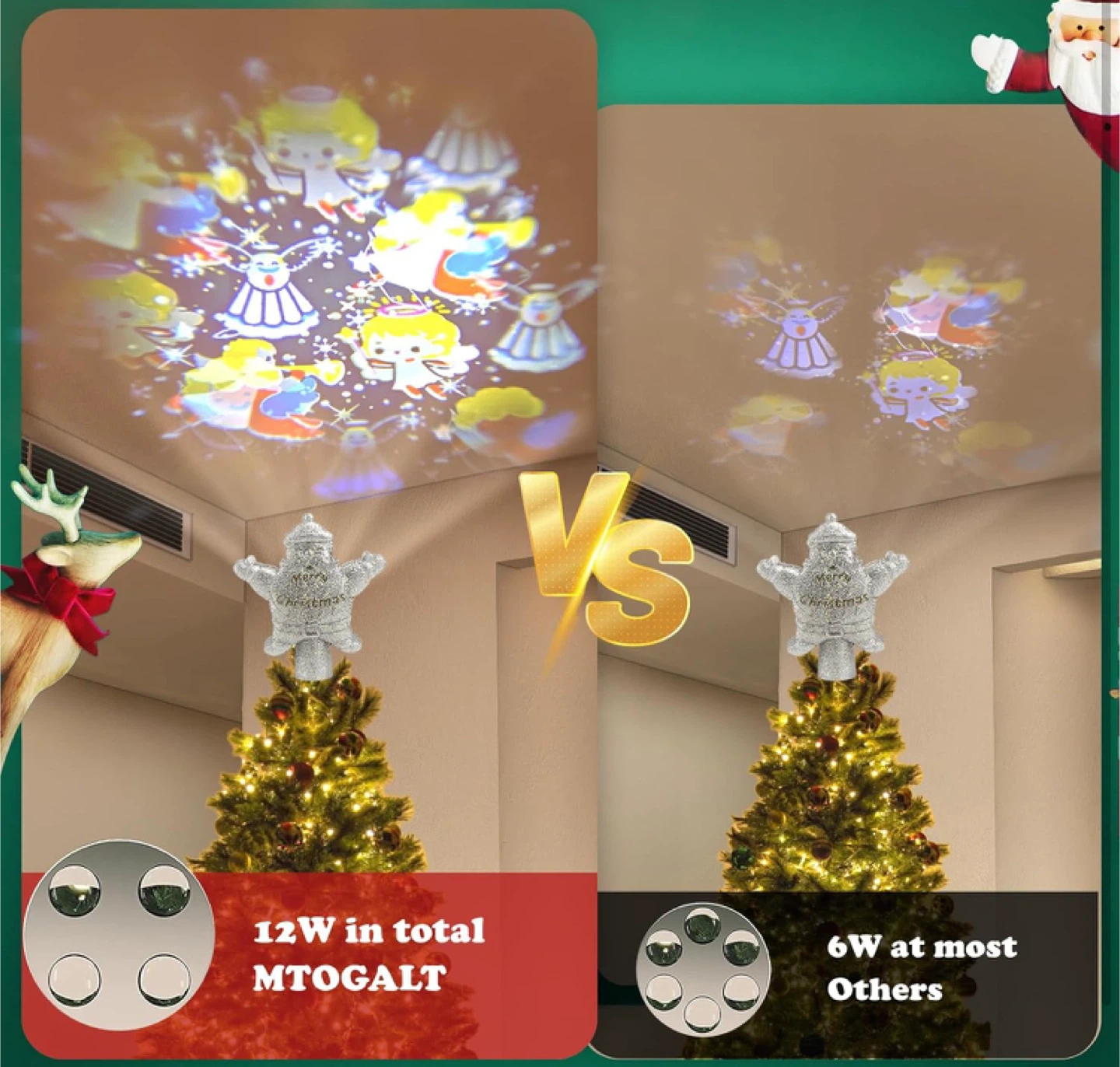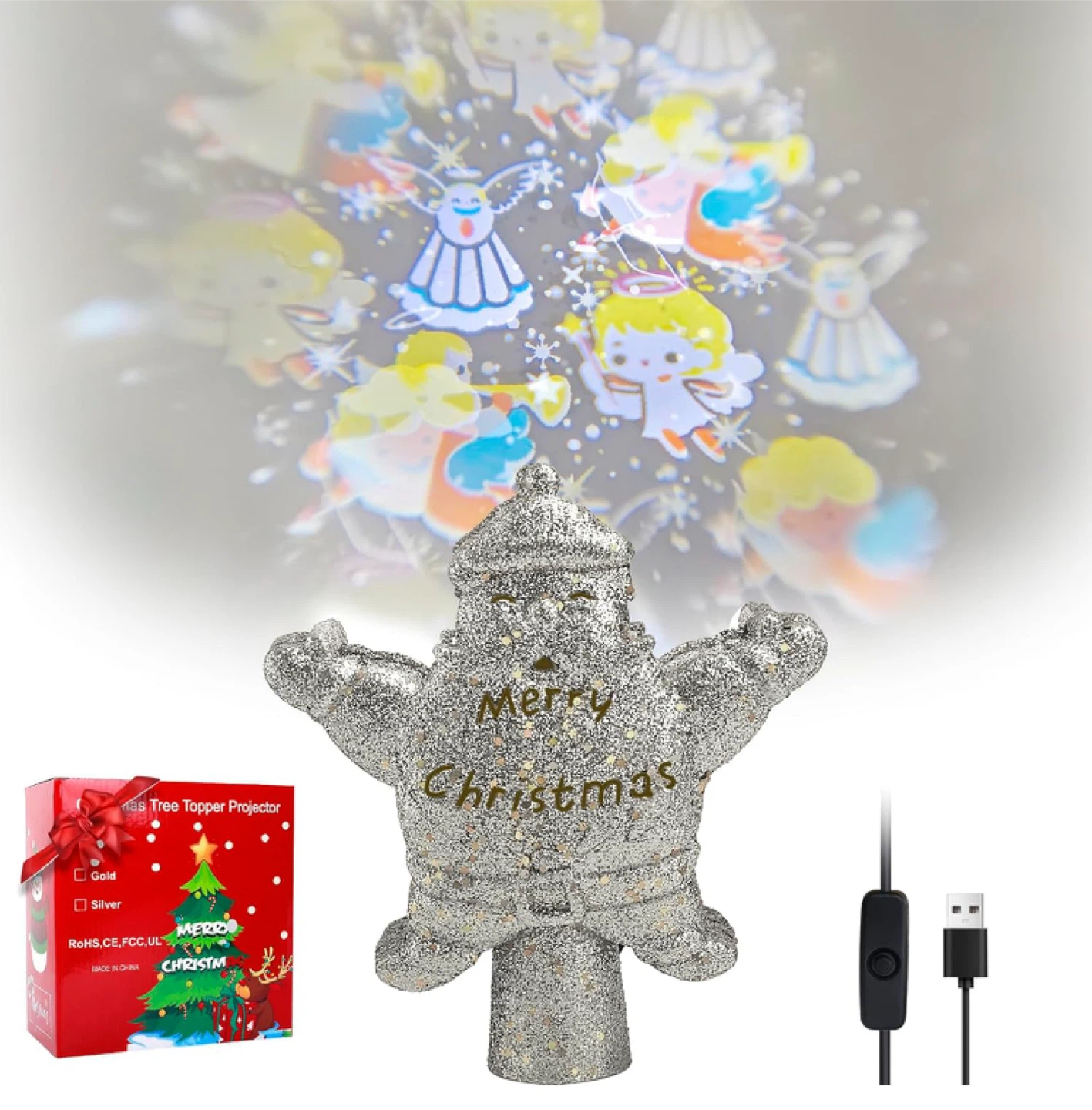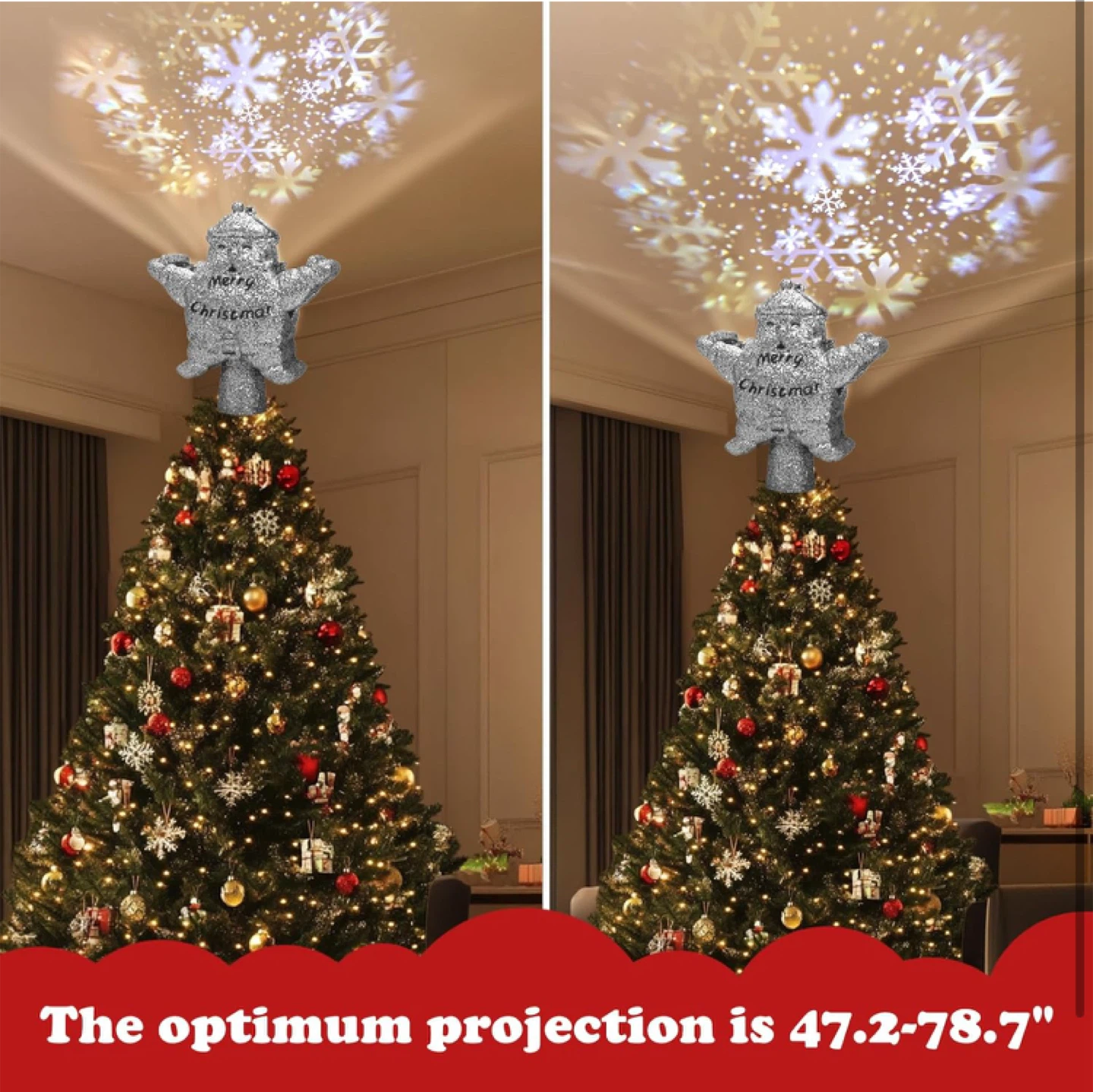 Christmas Tree Star Topper, Silver Santa Claus Tree Topper Projector, Snowflake Projector Tree Topper, Built-in 360° LED Rotating Lights with 4 Patterns Dynamic Projection for Xmas Tree Decoration