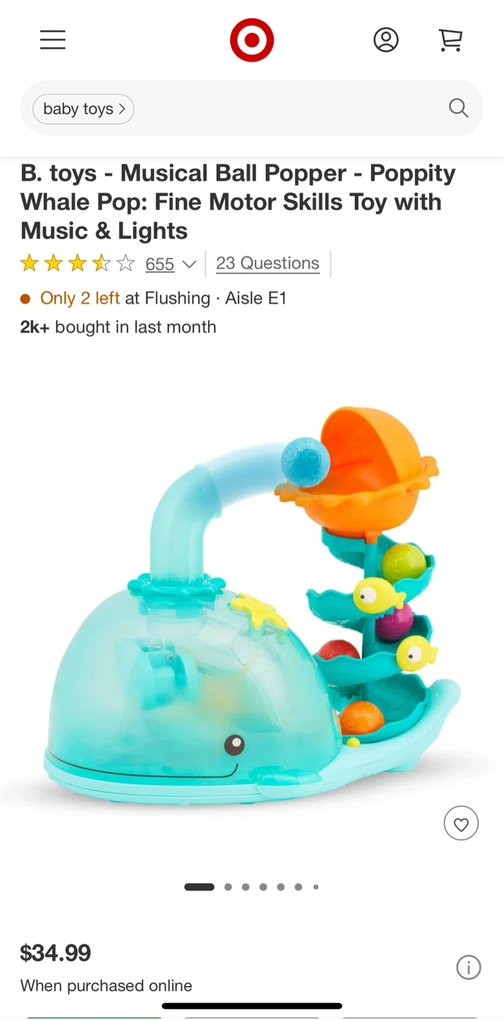 Selling a B. toys Musical Ball Popper called Poppity Whale Pop. It is a fine motor skills toy with music and lights. It's in great condition! Originally bought for $34.99