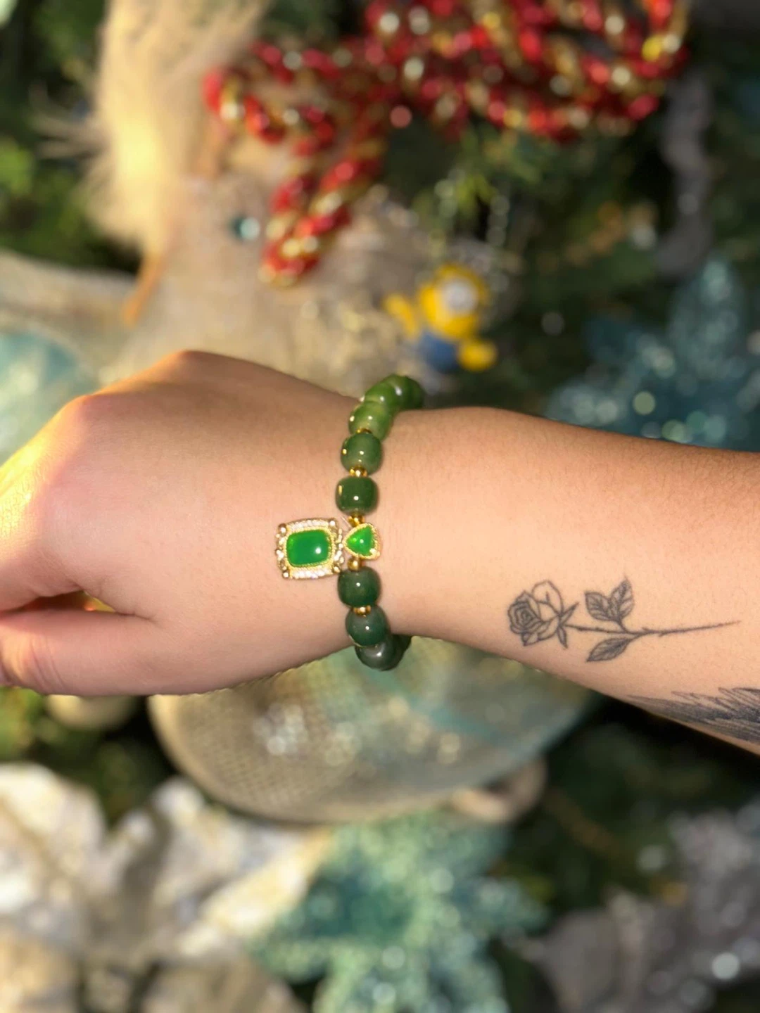 Jade Bead Bracelet with Green Gem Charm