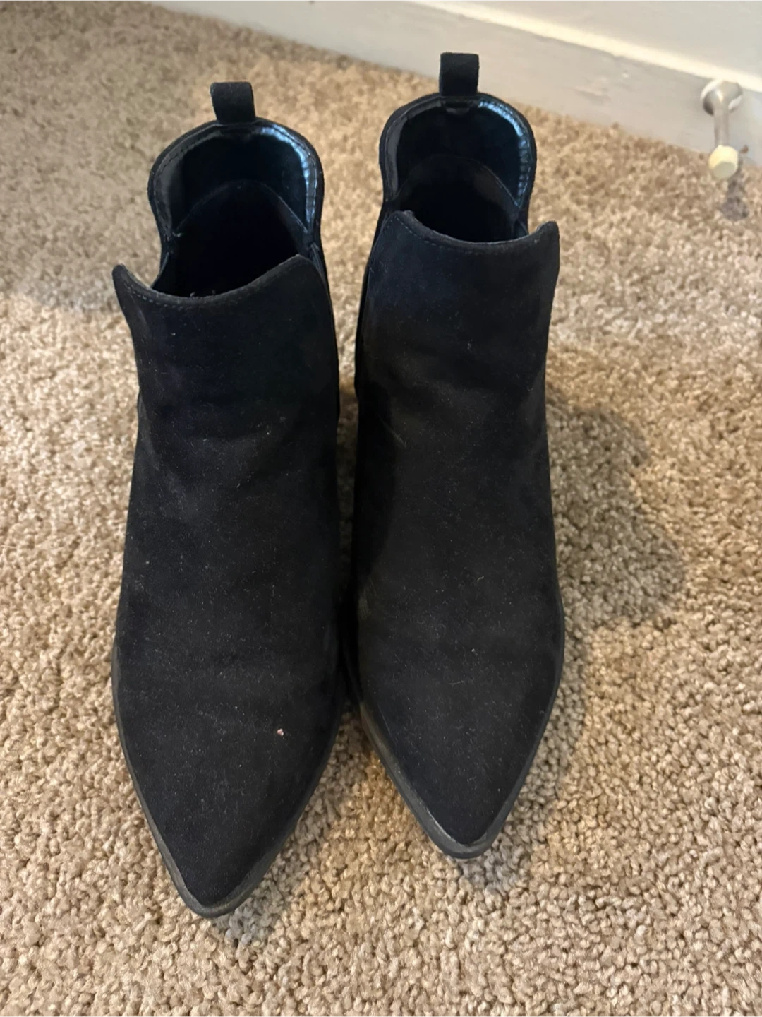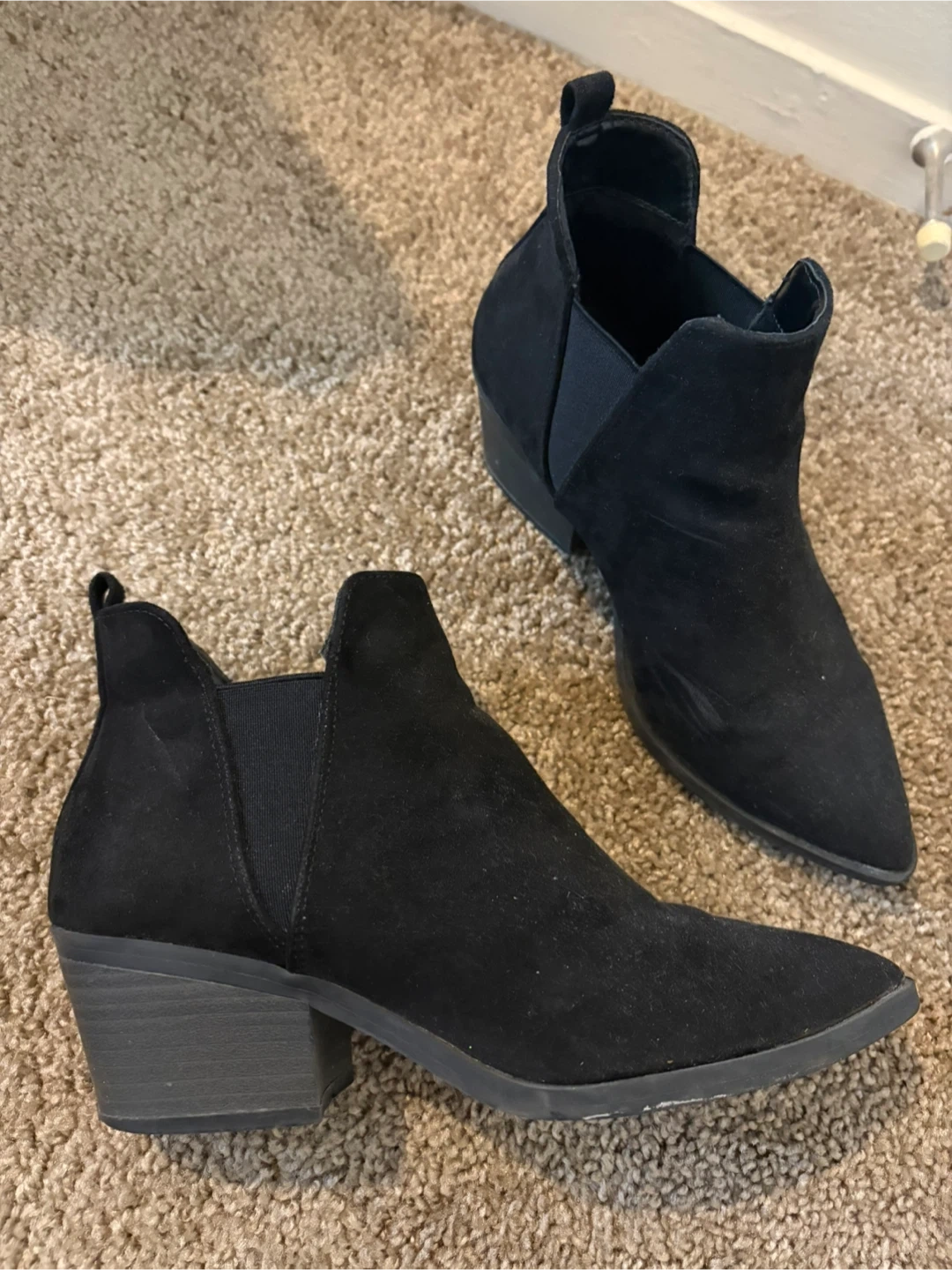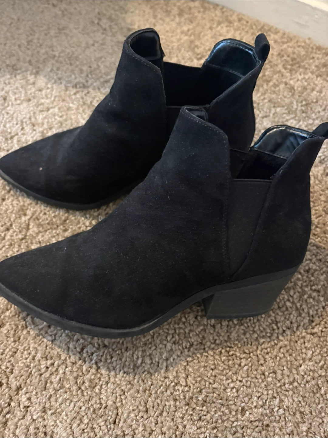 Black faux suede ankle boots with a pointed toe and a low heel. These boots feature elastic side panels for easy on and off. Size 7 wide. Universal threads. Memory foam insoles.