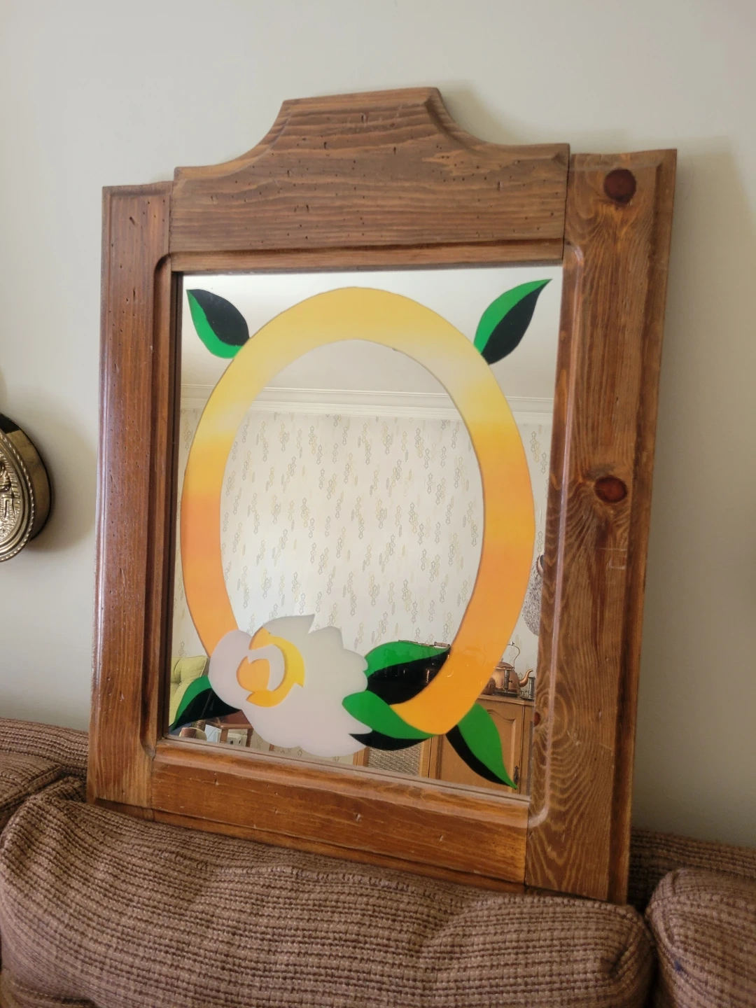 This decorative oval mirror features a rustic wooden frame. It's adorned with a colorful stained glass design of a floral element and leaves. The mirror's dimensions are approximately 29 inches tall and 23 inches wide.