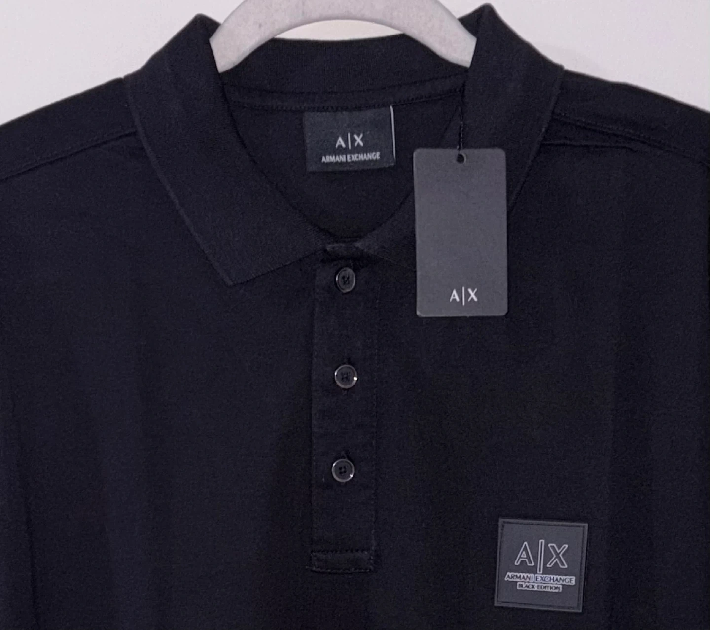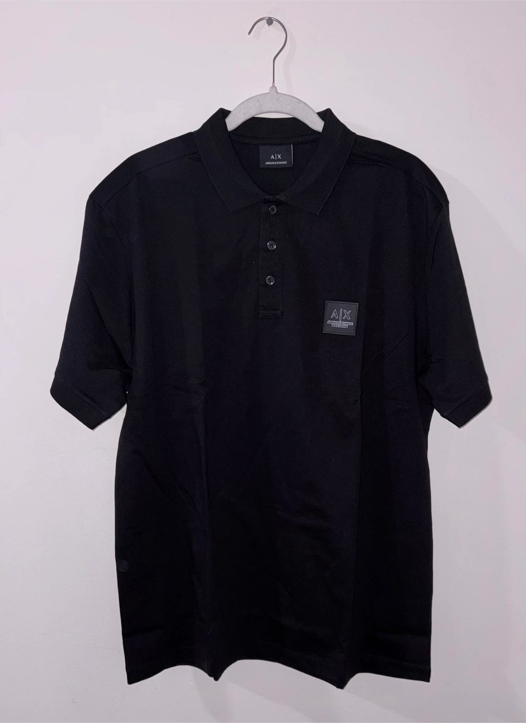 This is a black short-sleeve polo shirt from Armani Exchange. It features a classic collar and a button placket. The shirt has a discreet AX logo patch on the chest. A great staple piece for any wardrobe!