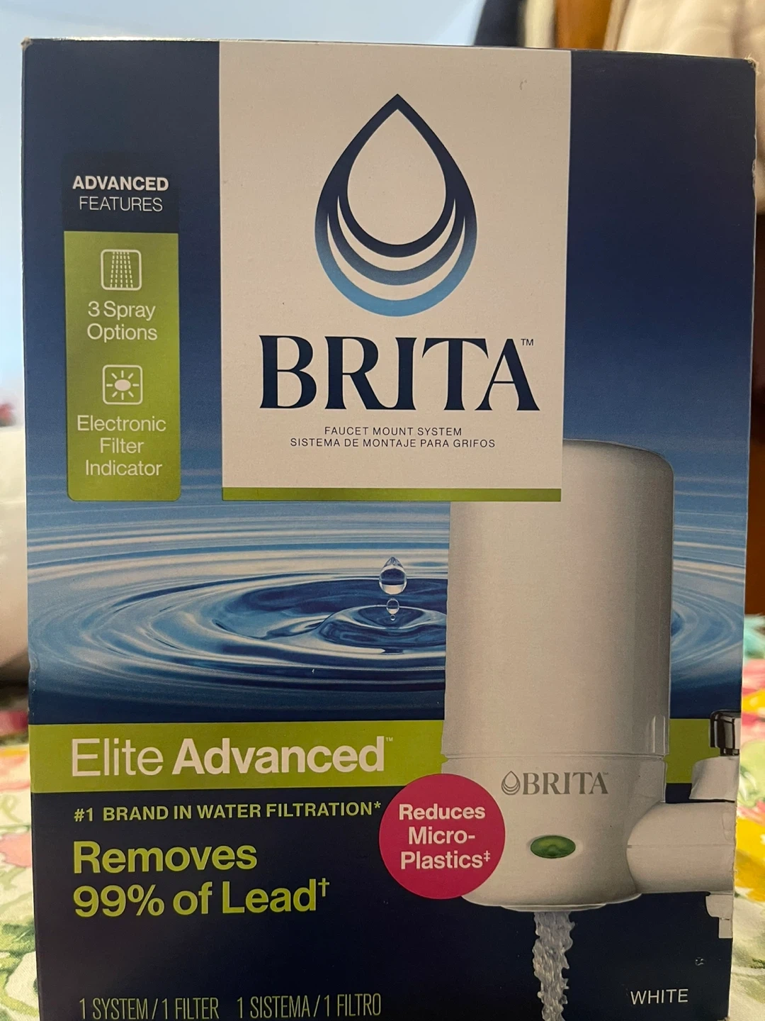 This Brita faucet mount water filter system is in white. It offers 3 spray options and an electronic filter indicator. The system reduces lead by 99% and micro-plastics. Filter lasts for 100 gallons (378 liters).