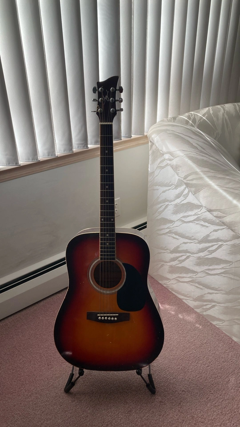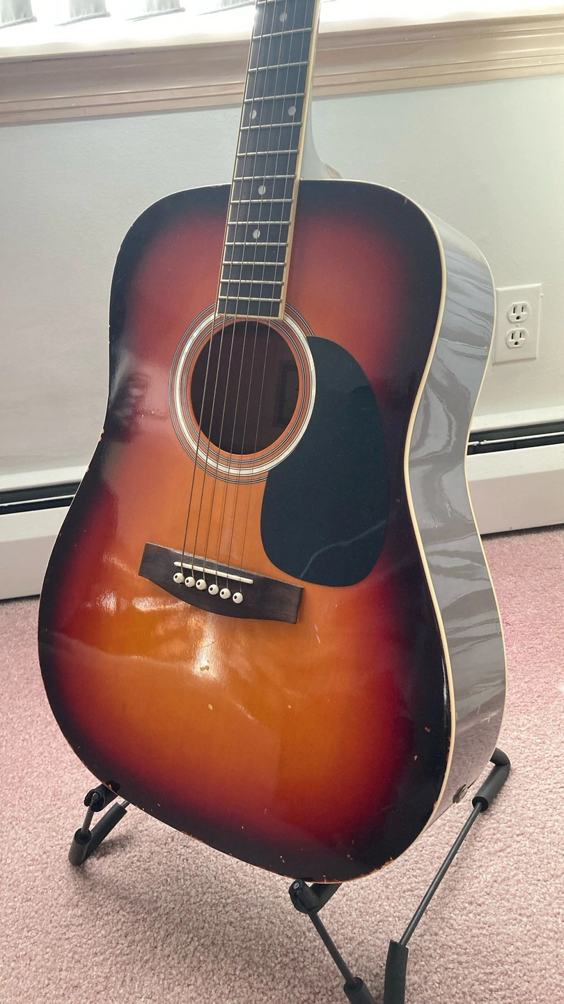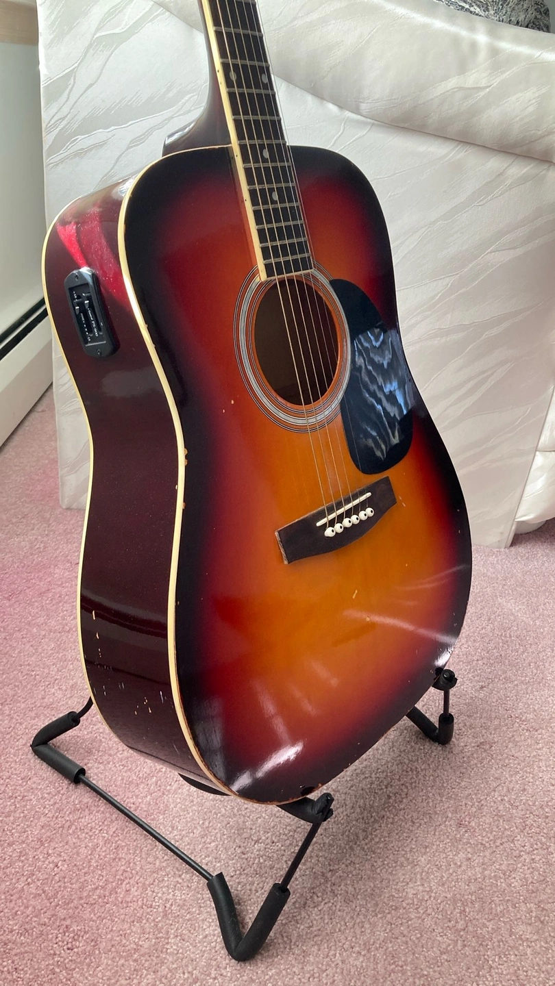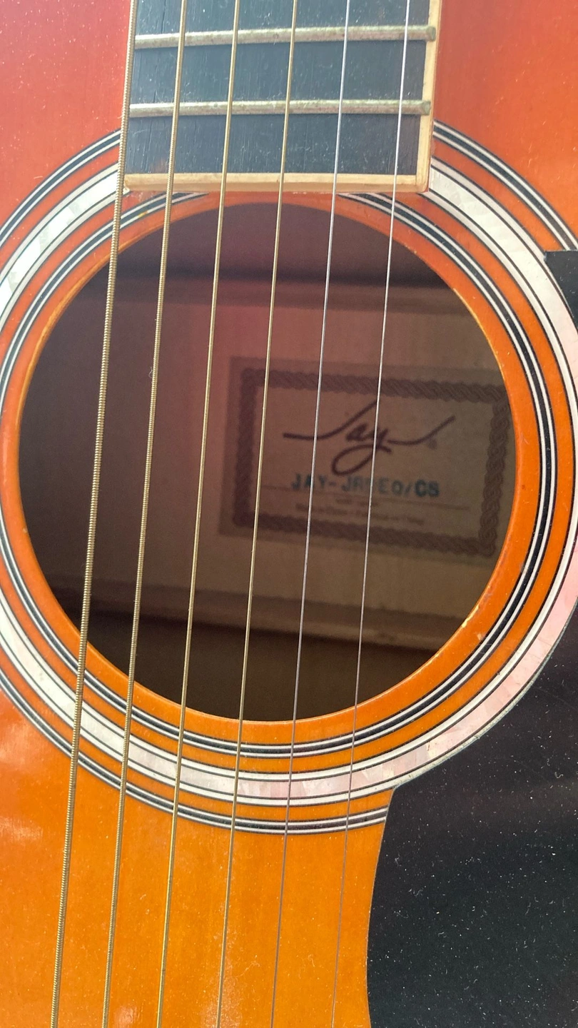 Used condition, could use a new set of strings and some glue on the bridge. Very nice bound neck with a rosewood fretboard. Body Color: Sunburst. Right-handed. Brand: Jay Turser.