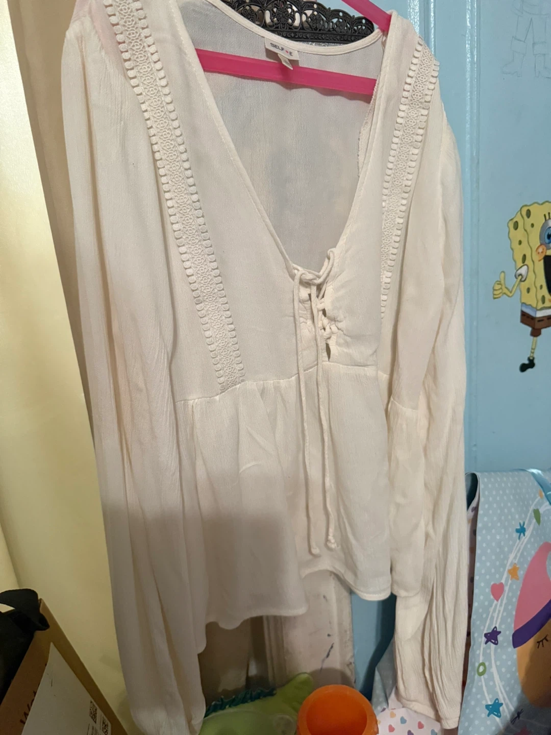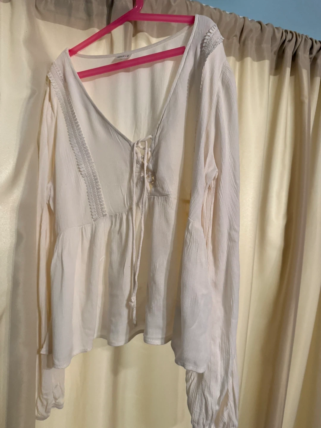 Selling a cute SELFiE blouse in a cream color! It's a size L ,but feels like Medium, and features a stylish lace-up design. Perfect for a casual or dressed-up look! has a tiny stain.