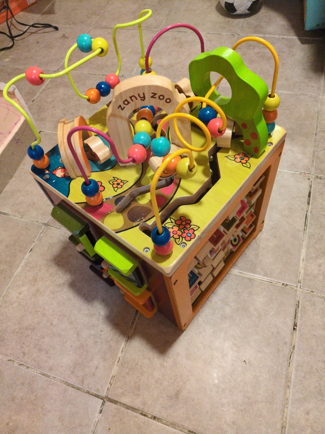 Wooden activity cube with bead maze, animal shapes, and block features. It's a colorful toy designed for young children to explore. This cube offers various interactive elements for developing fine motor skills.