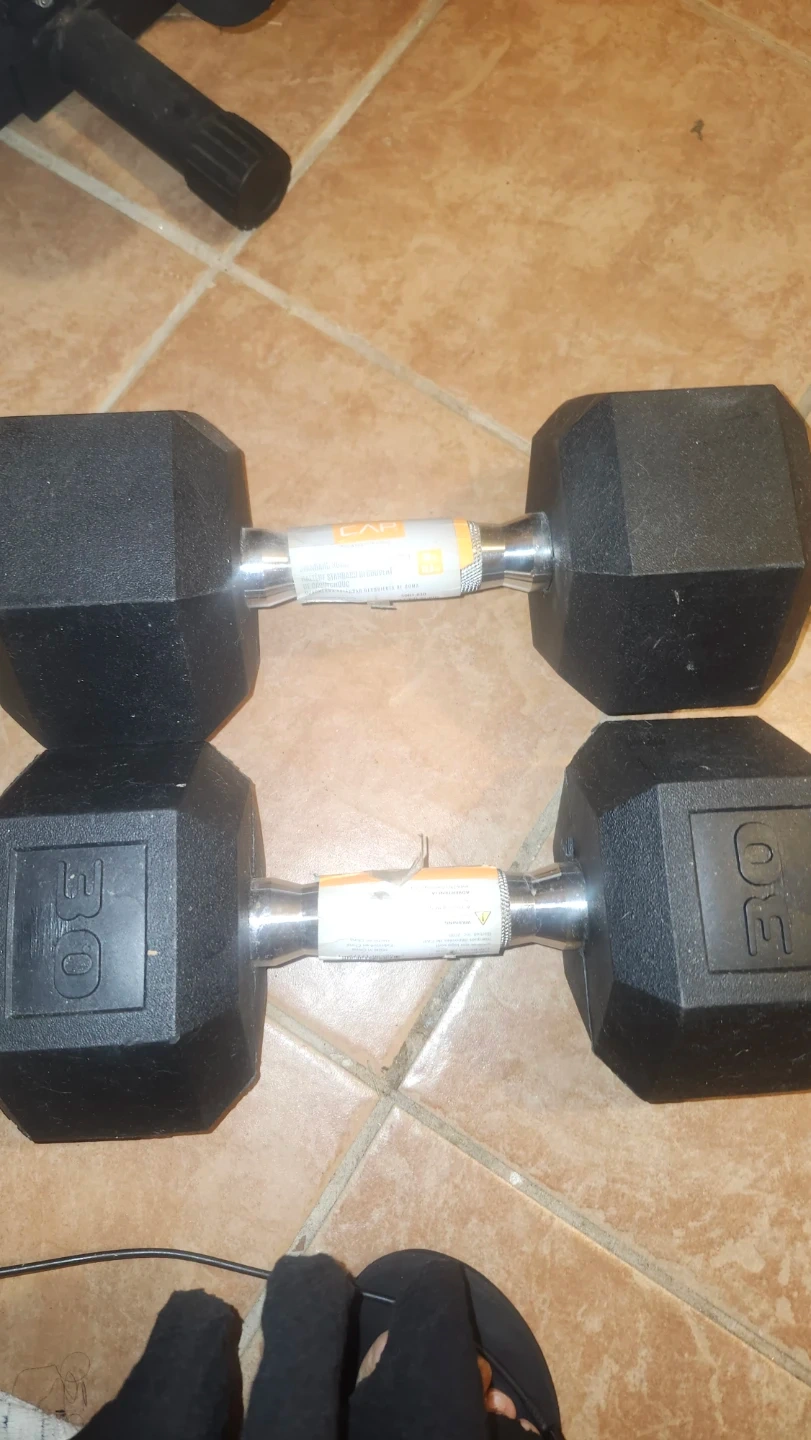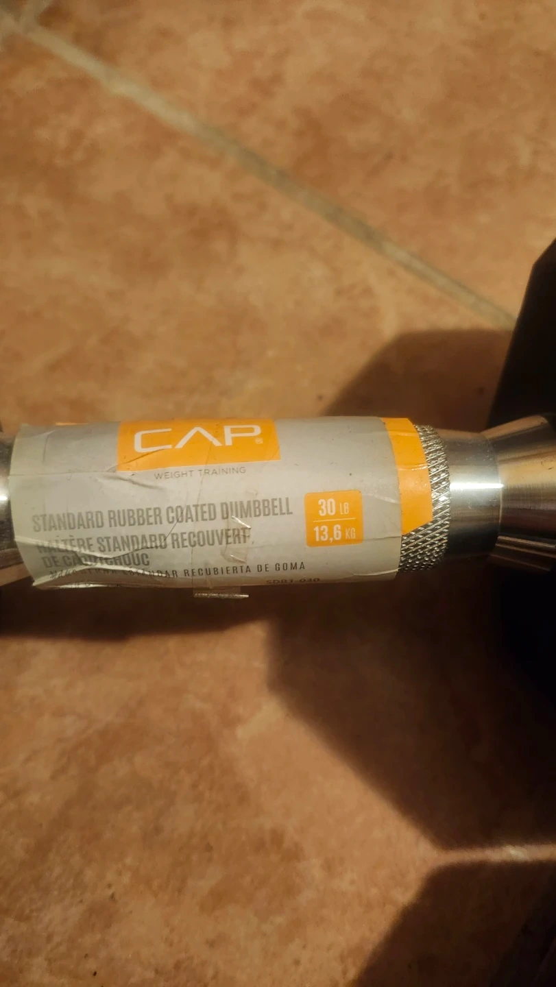 This is a CAP brand standard rubber coated dumbbell. It weighs 30 lb, which is 13.6 kg. The handle is made of metal for a secure grip.
