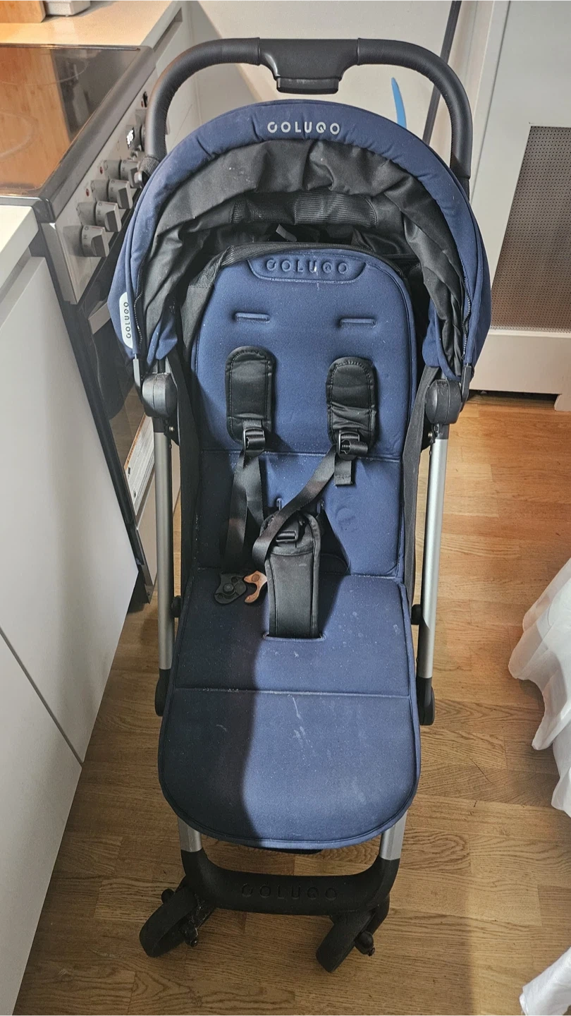 This is a Diono Colugo stroller in navy blue. It's a lightweight and compact stroller, perfect for on-the-go parents. It features a comfortable seat with a 5-point harness and a storage basket underneath.