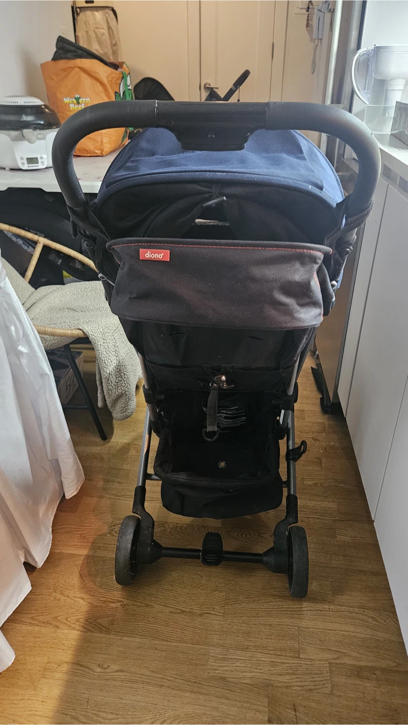 This is a Diono Colugo stroller in navy blue. It's a lightweight and compact stroller, perfect for on-the-go parents. It features a comfortable seat with a 5-point harness and a storage basket underneath.