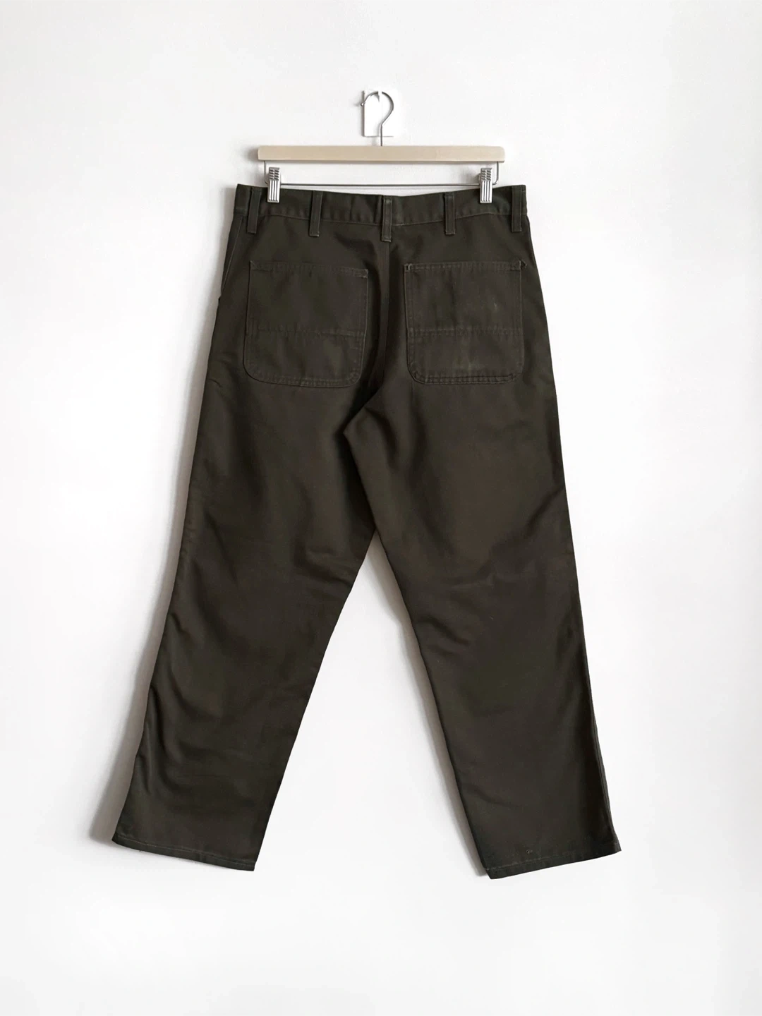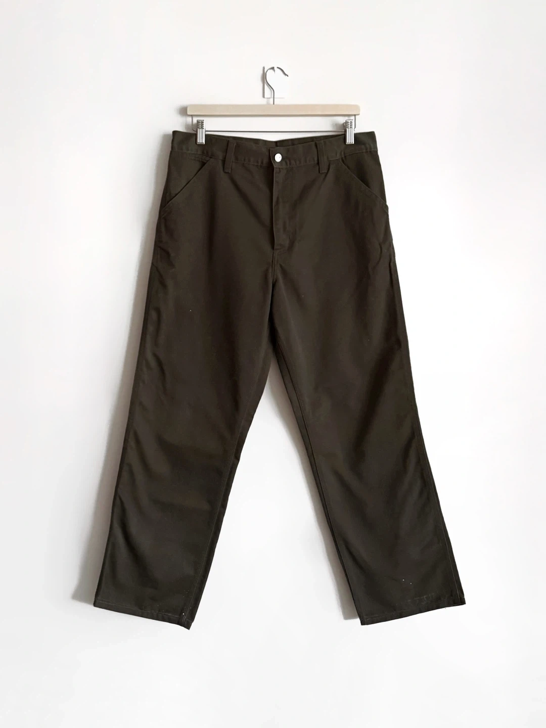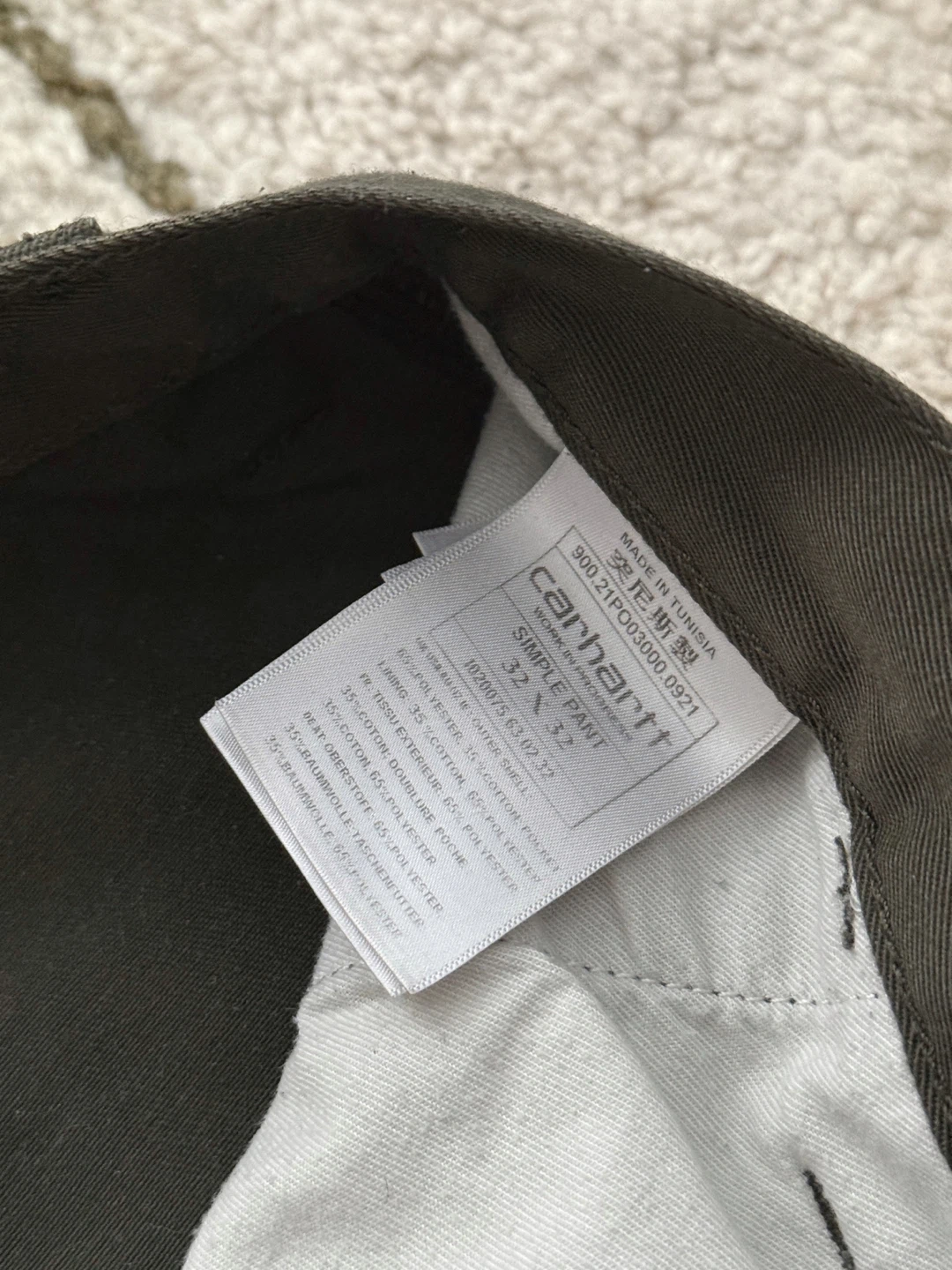 Cotton/poly blend. Tag size 32×32, inseam hemmed to approx. 29”. Pre-owned condition with minor wear and small marks (see photos). Carhartt patch on the back pocket has been removed.