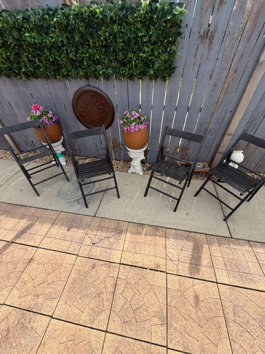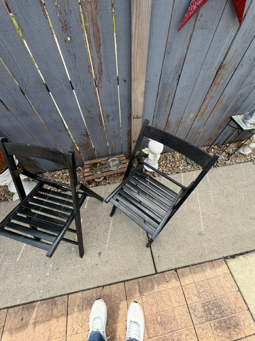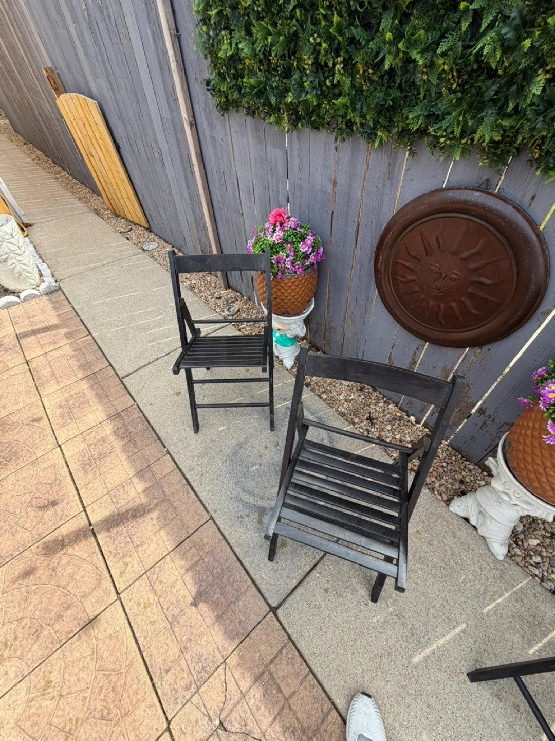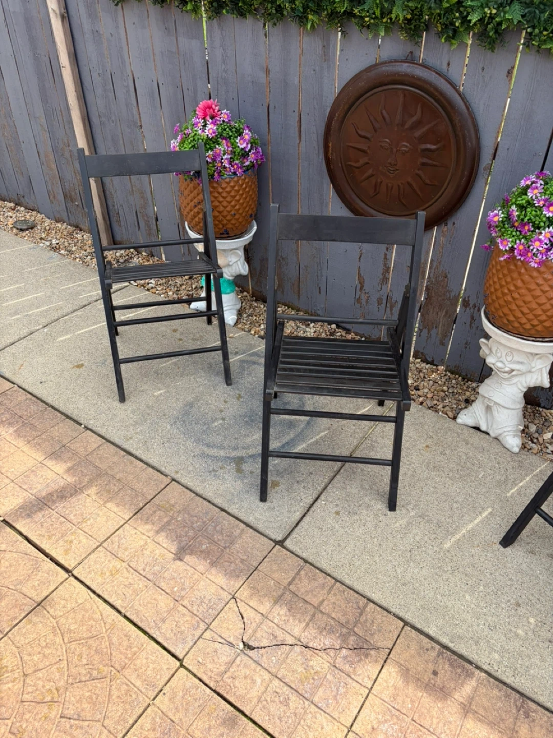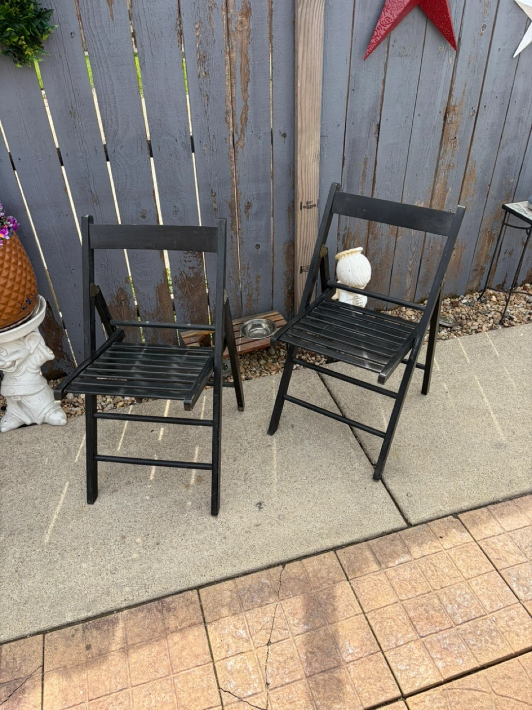 This set includes four black folding chairs. They are made of wood and are perfect for outdoor seating or extra guests. The chairs fold for easy storage.