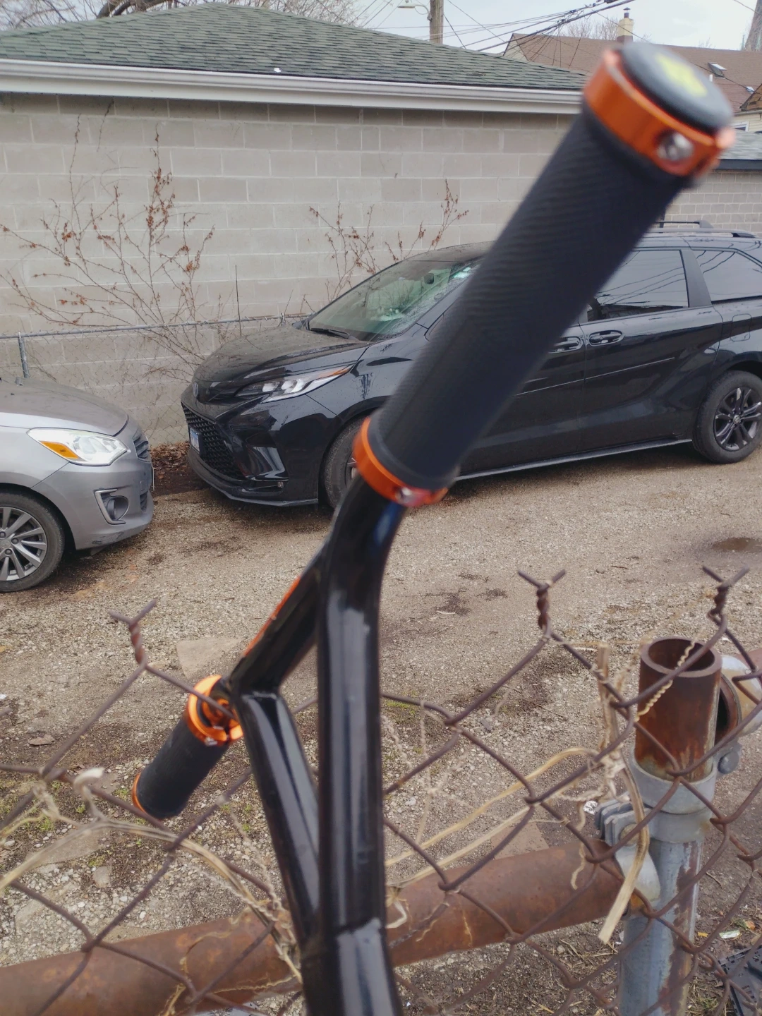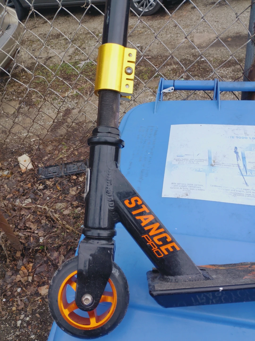 This is a Stance Pro freestyle scooter. It's black with orange accents on the wheels and handlebars. Great for tricks and cruising around town!
