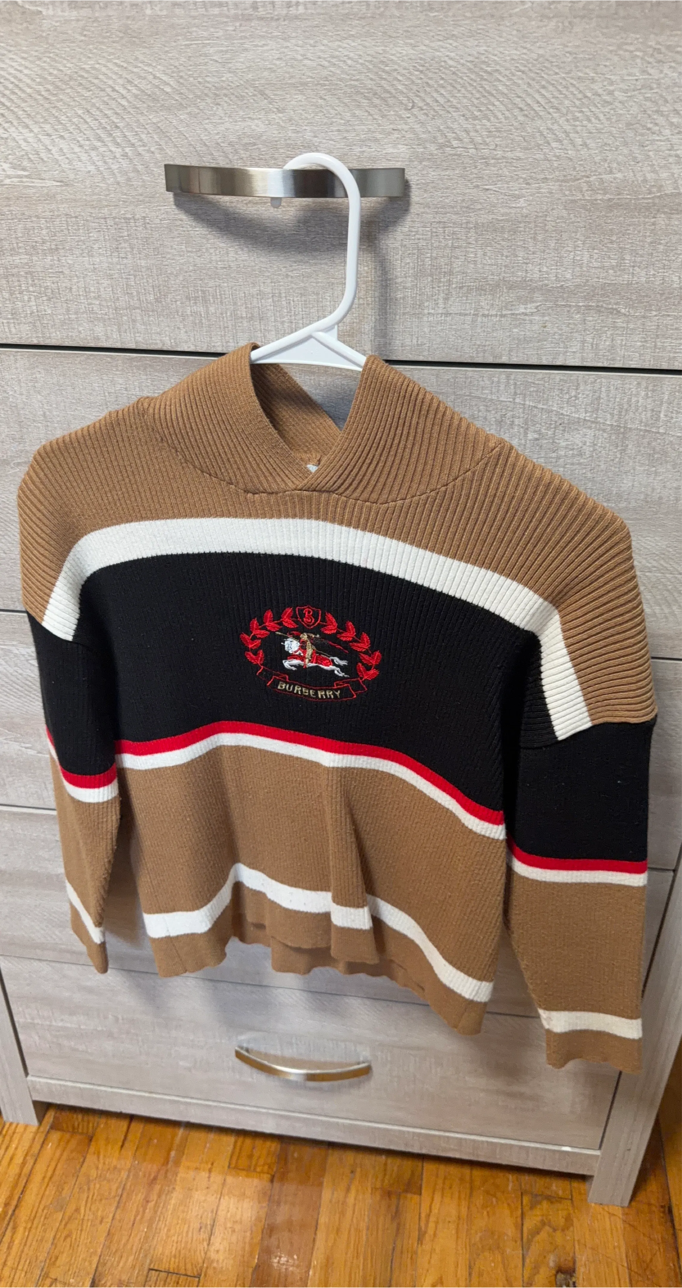 This is a Burberry sweater with a mock neck and striped pattern. It features the brand's equestrian knight emblem embroidered on the chest. Made from a knit material.