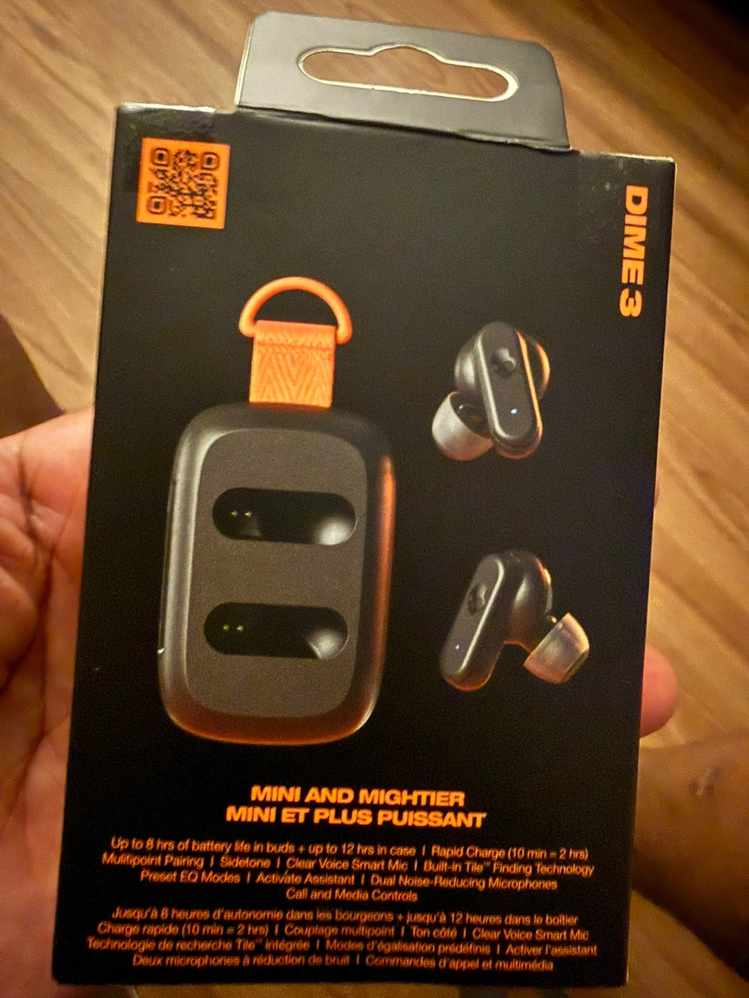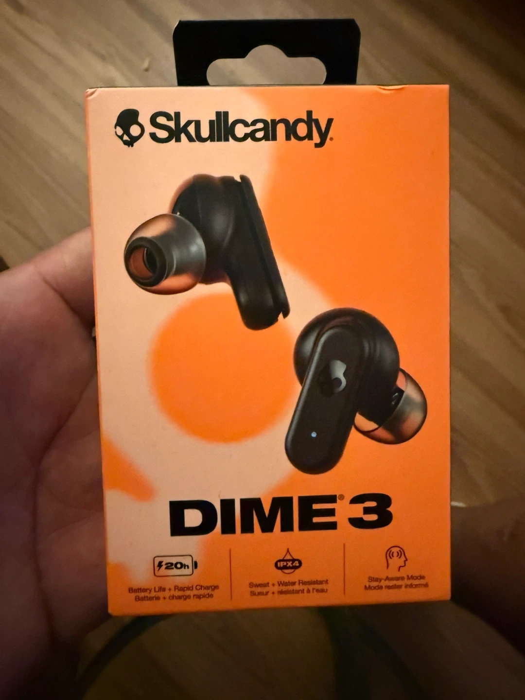 These are the Skullcandy Dime 3 true wireless earbuds. They offer up to 8 hours of battery life in the buds, with an additional 12 hours from the charging case. They're sweat and water-resistant with IPX4 rating. Finding technology and multipoint pairing are also included.