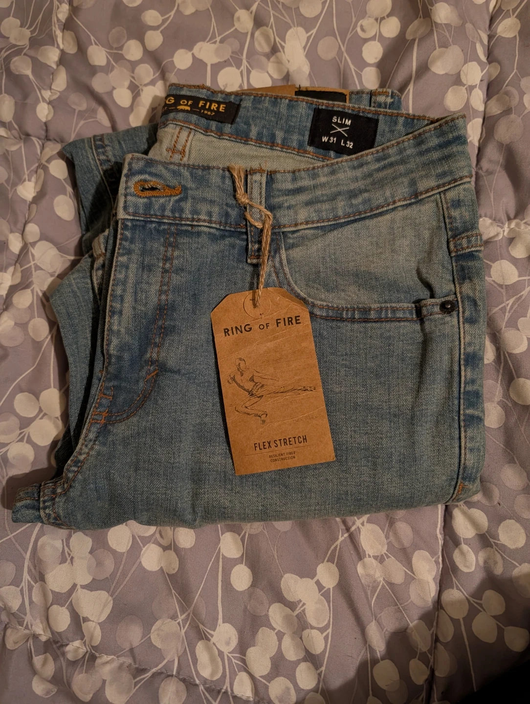 Brand new Ring of Fire men's slim fit jeans. These feature flex stretch denim for comfort. The size is a 31 waist and 32 inseam.