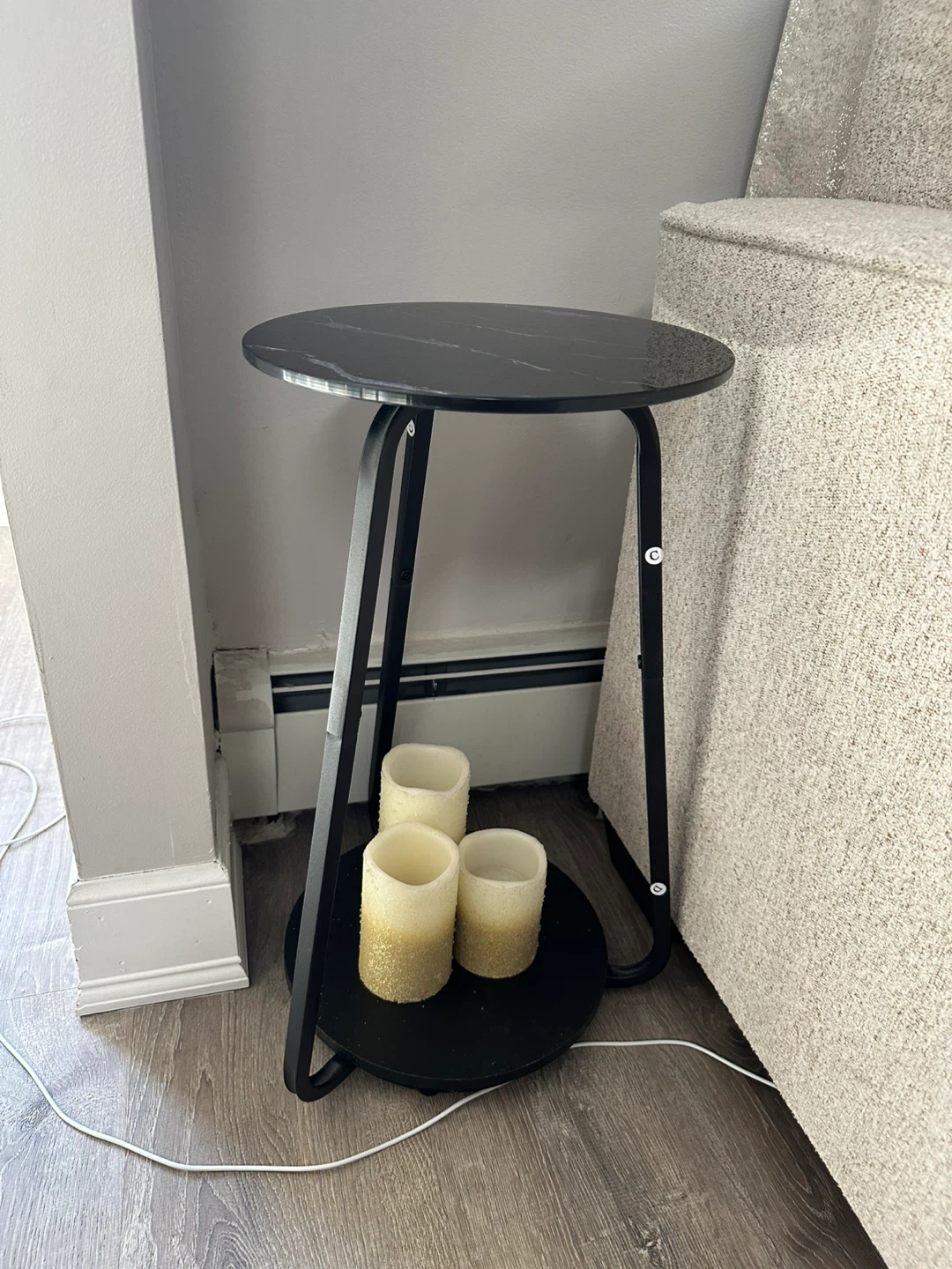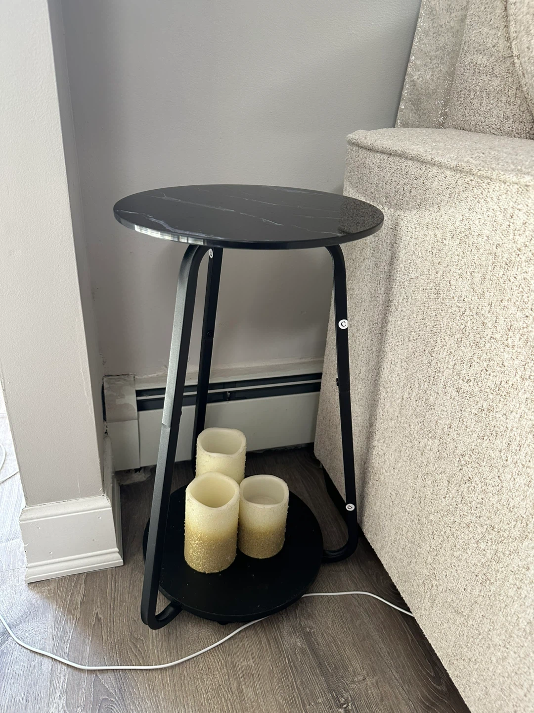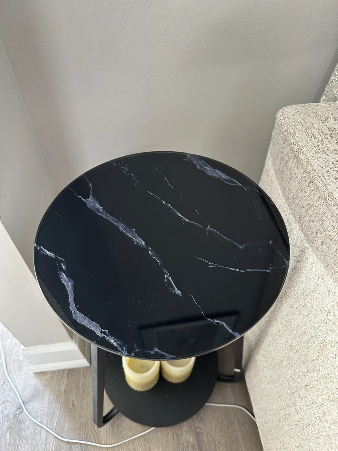 Selling a sleek black round side table. It's in great condition and would look great in any room! The table has a faux marble top and a sturdy metal frame