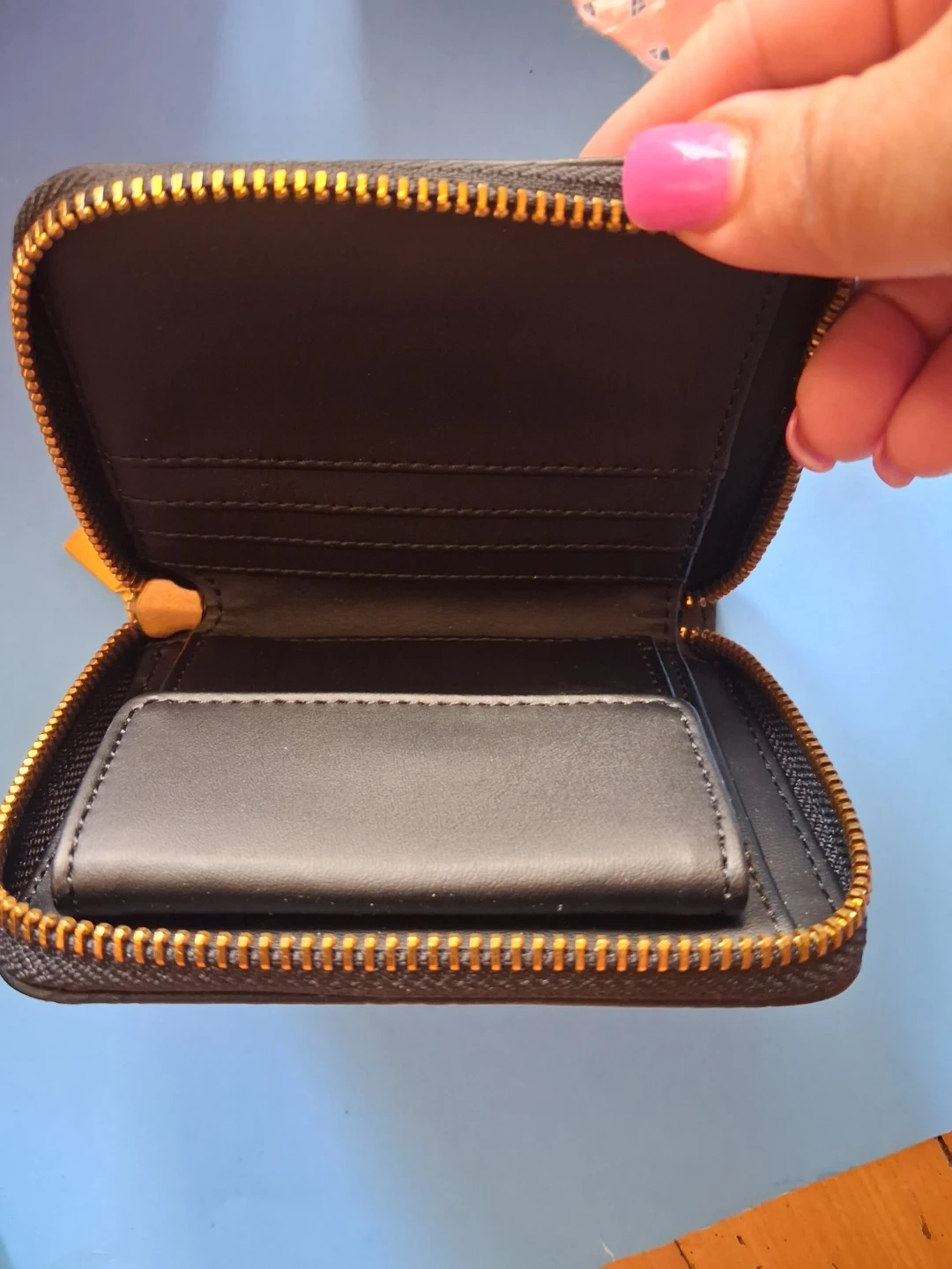 This is a Guess zip-around wallet with an "Est 1981" design. It features multiple card slots and a zippered compartment inside. The wallet is made of faux leather with a repeating Guess logo pattern.