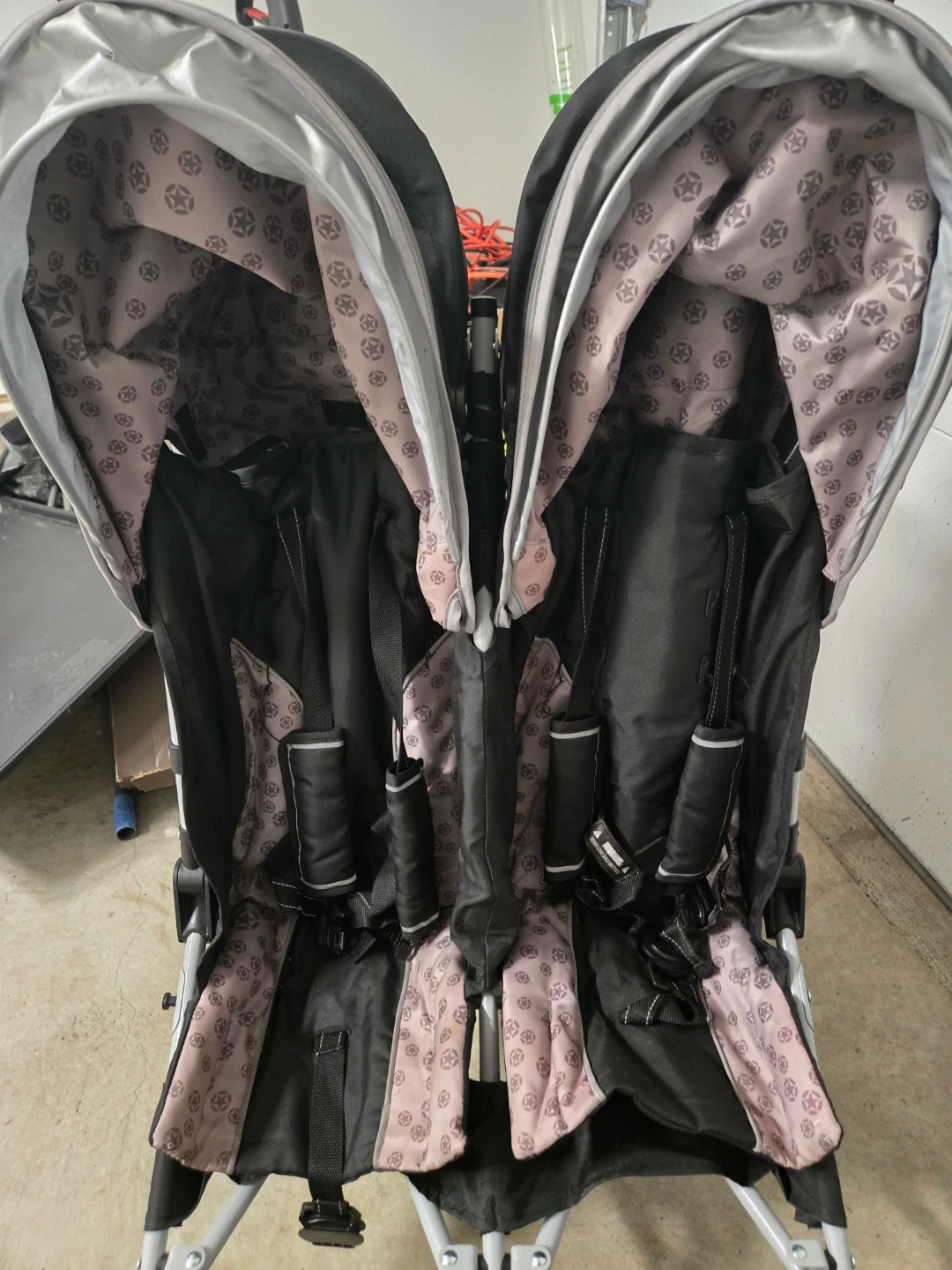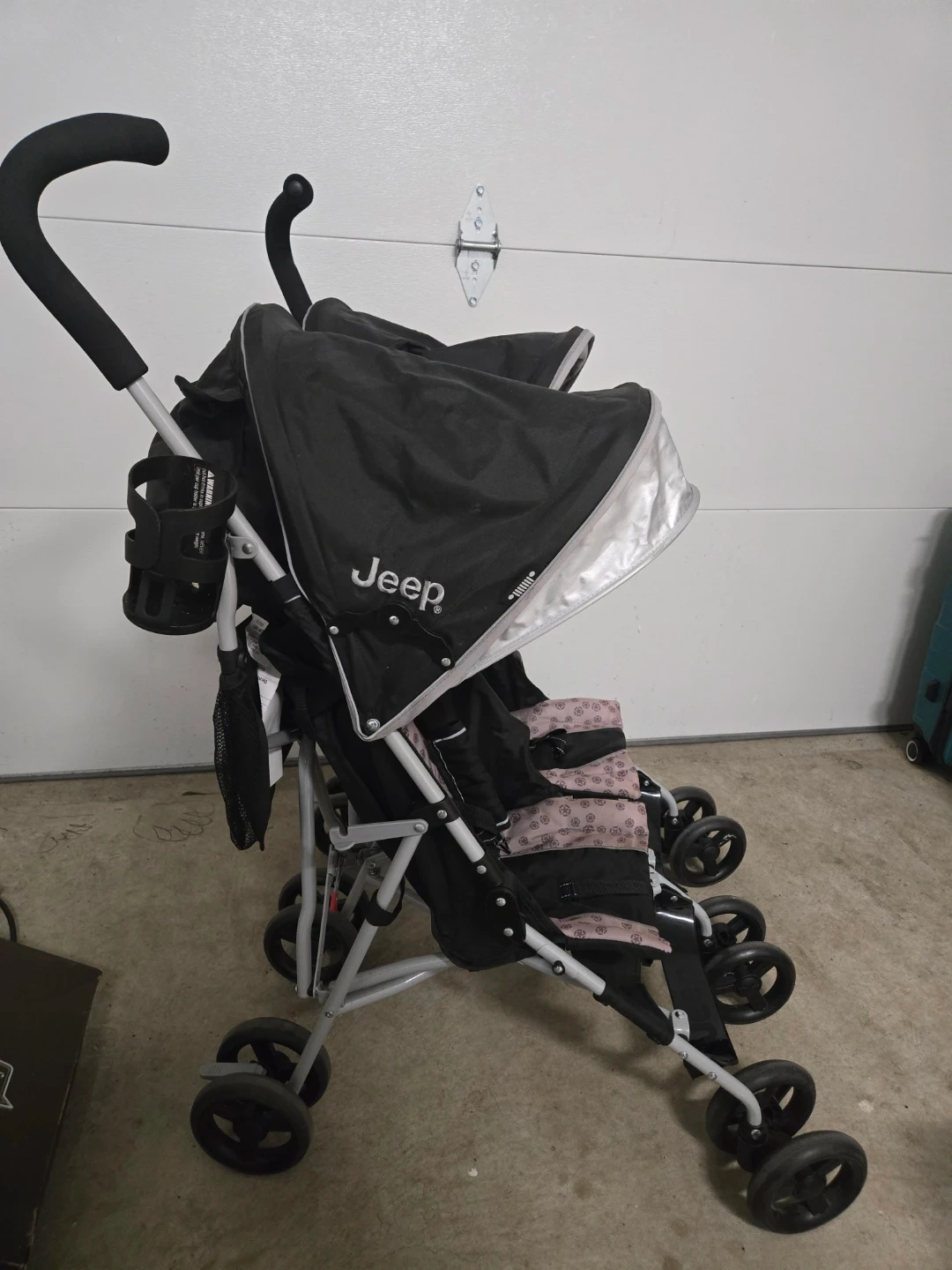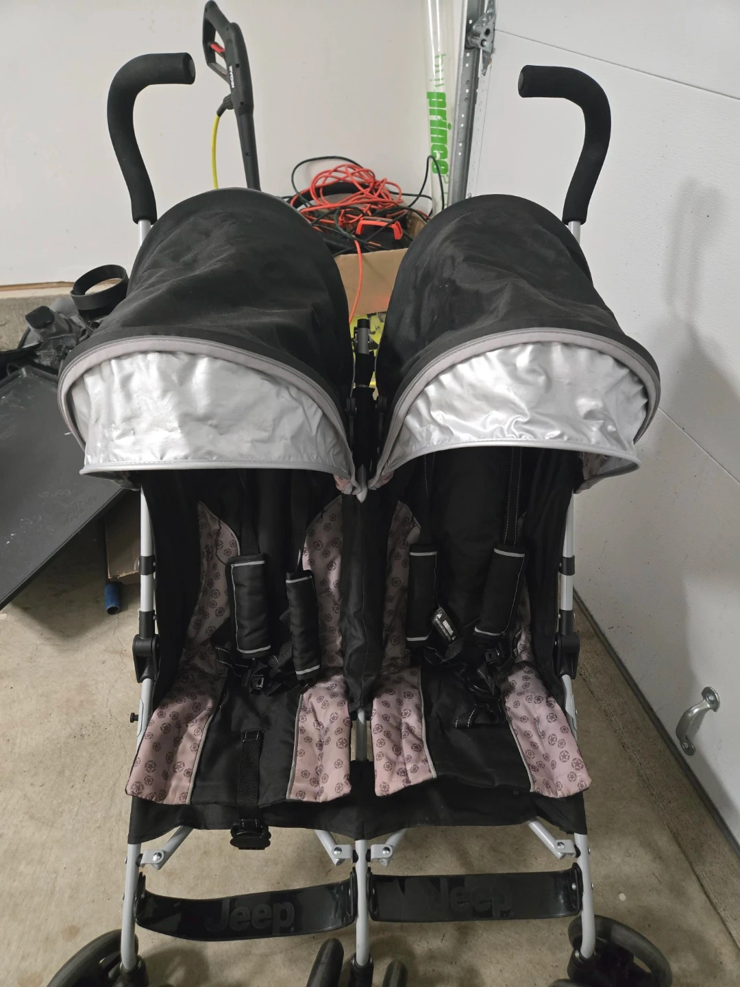 Black Jeep twin stroller with a silver trim and pink patterned fabric. It has a lightweight frame and features individual canopies. Comes with a cup holder and storage baskets underneath. Moving and need gone by March 2nd!!!