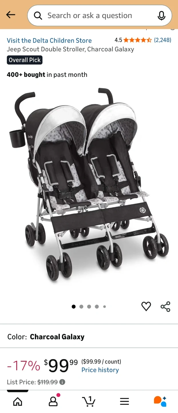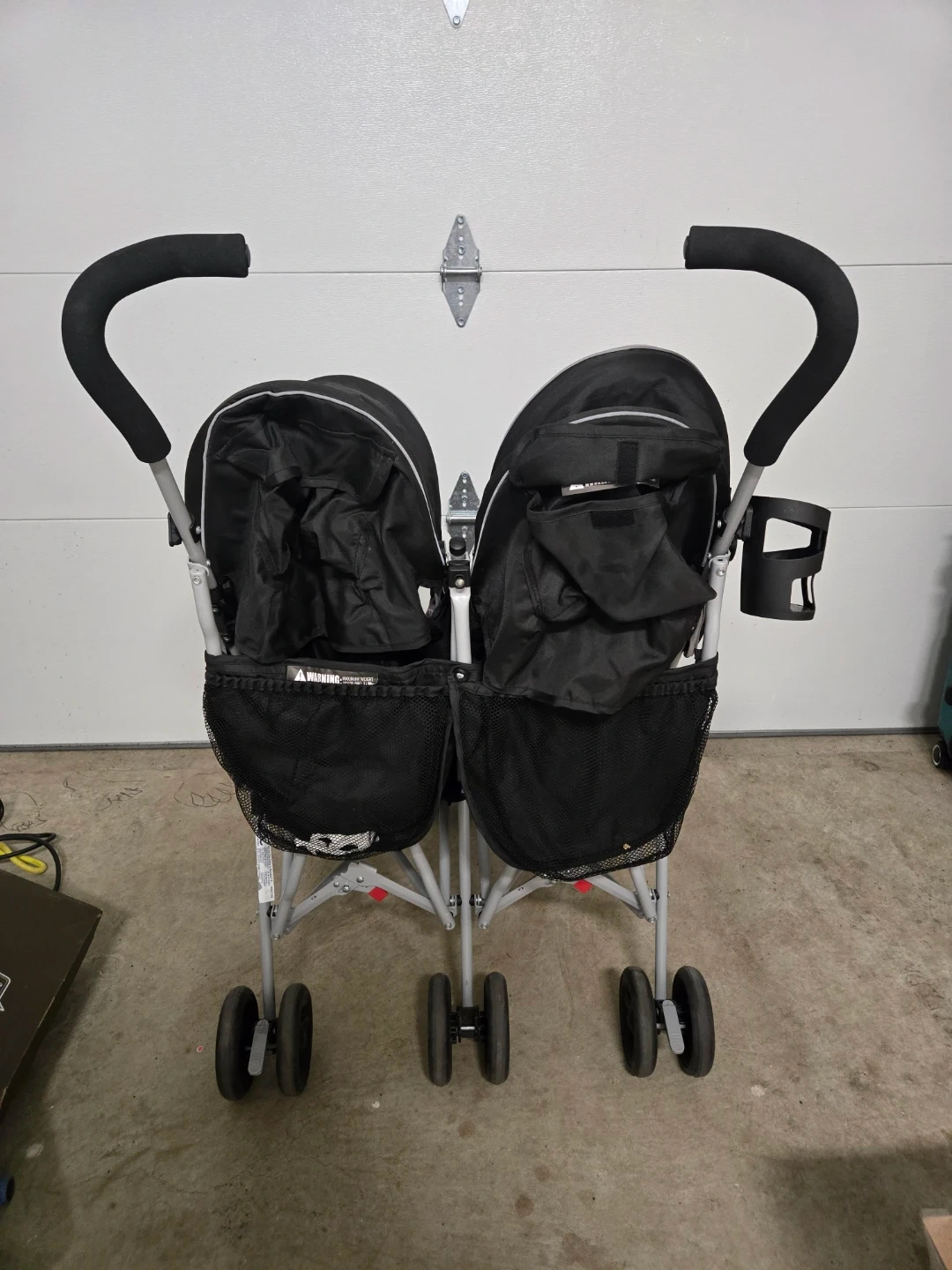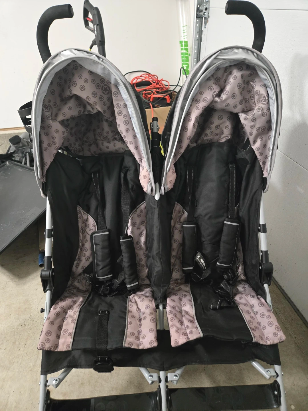 Black Jeep twin stroller with a silver trim and pink patterned fabric. It has a lightweight frame and features individual canopies. Comes with a cup holder and storage baskets underneath. Moving and need gone by March 2nd!!!