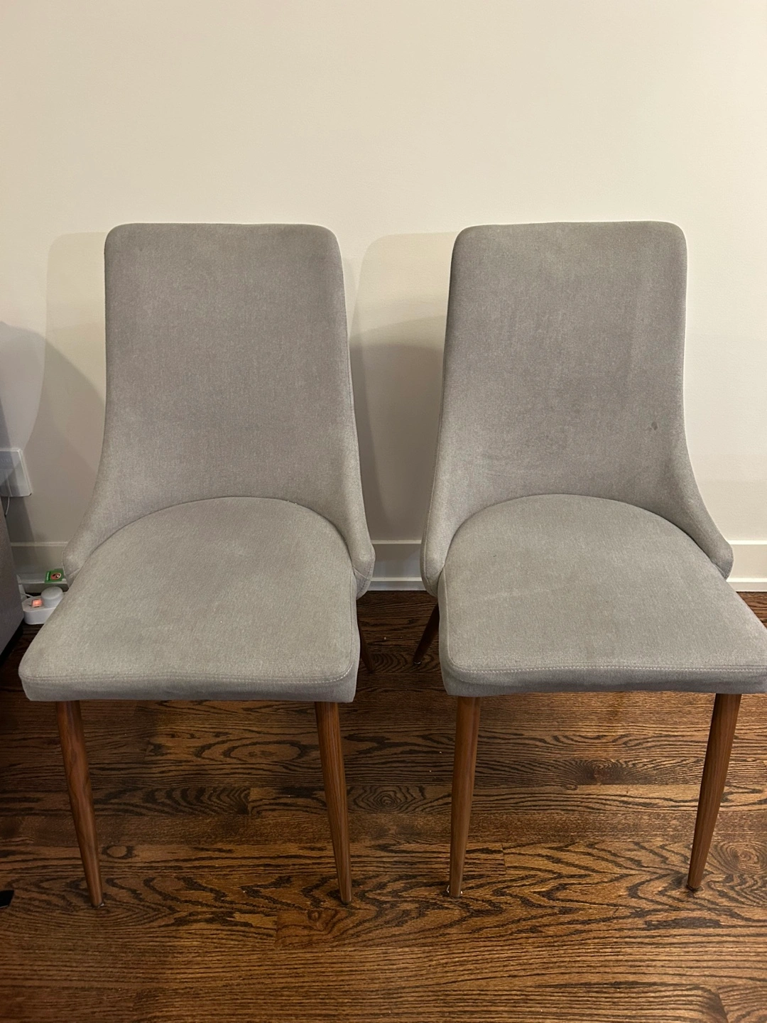 Selling a set of two gray dining chairs. They're in great shape and ready to add some style to your dining area! The chairs are a neutral gray color that will match most decor.