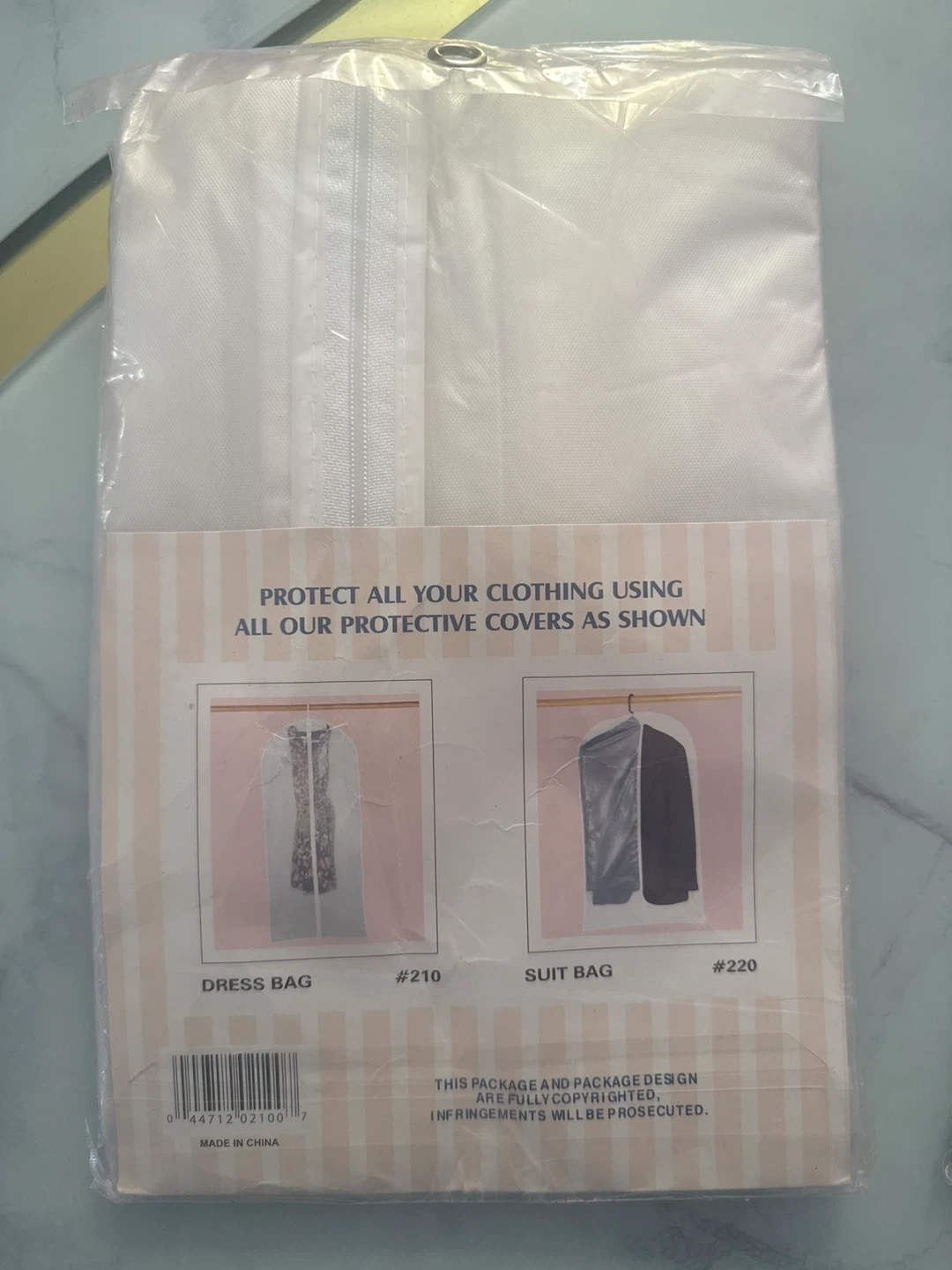 Protects clothing from dust, dirt, and mildew. Each bag measures 24" x 54". Includes zipper closure.