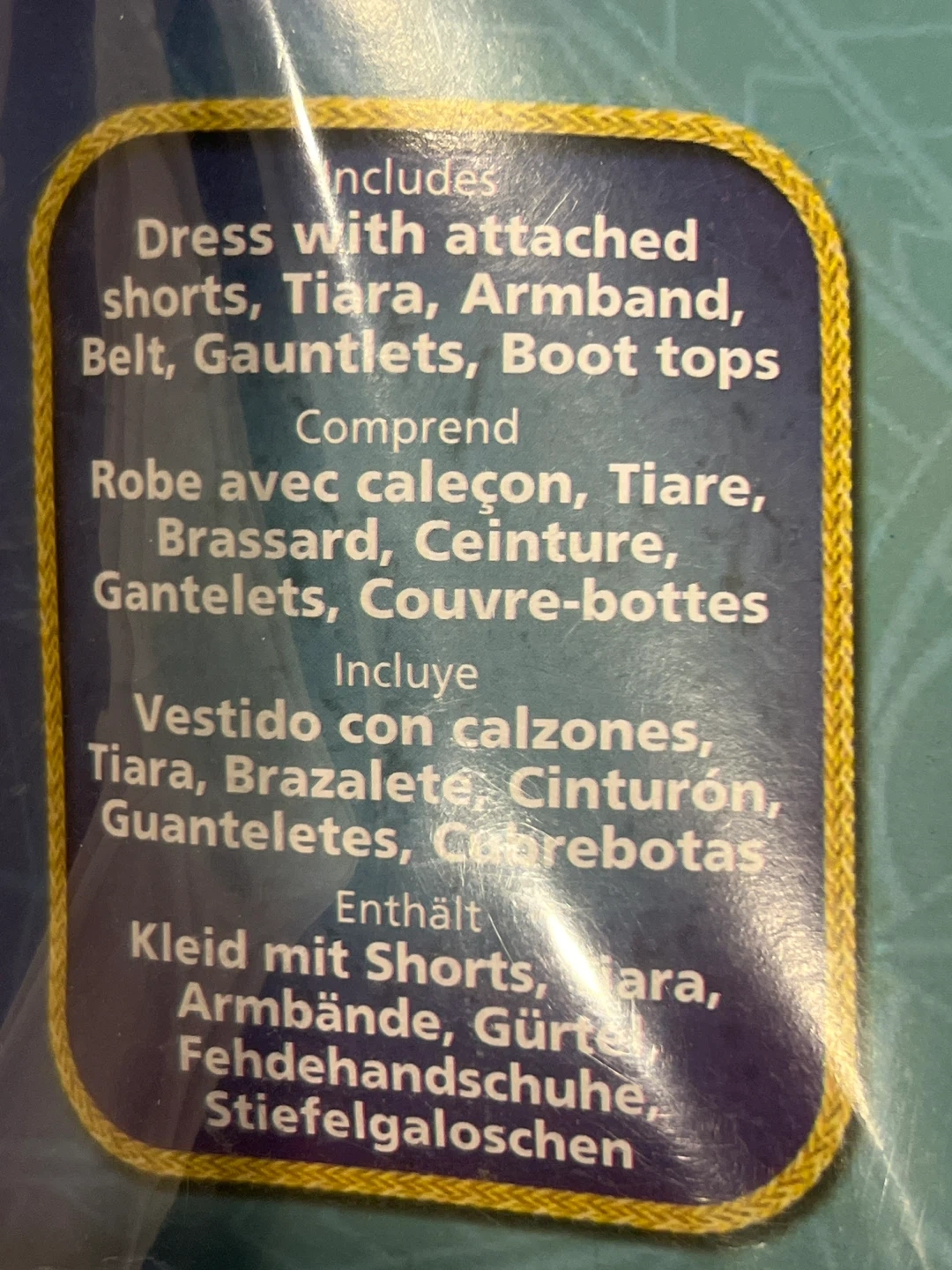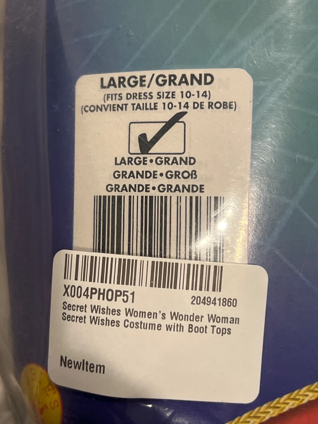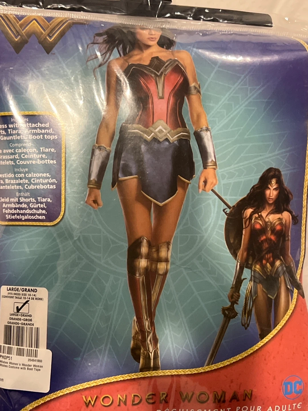 This Secret Wishes Women's Wonder Woman costume includes a dress with attached shorts, tiara, armband, belt, gauntlets, and boot tops. It's a size Large, fitting dress sizes 10-14. Perfect for costume parties or Halloween!