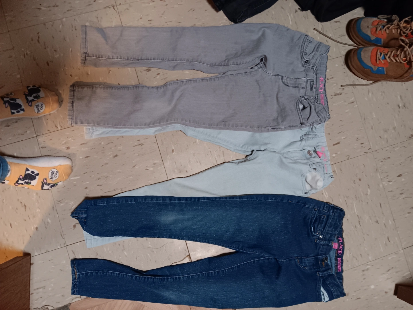 Three pairs of girls jeans. Grey, light blue, and dark wash denim. Good condition.